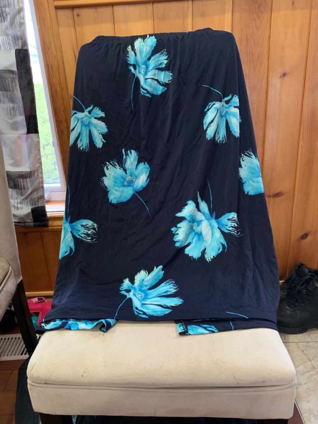 A plus size stylish navy blue skirt featuring a vibrant blue floral print. It has an elastic waistband for comfort. This skirt is perfect for casual wear.