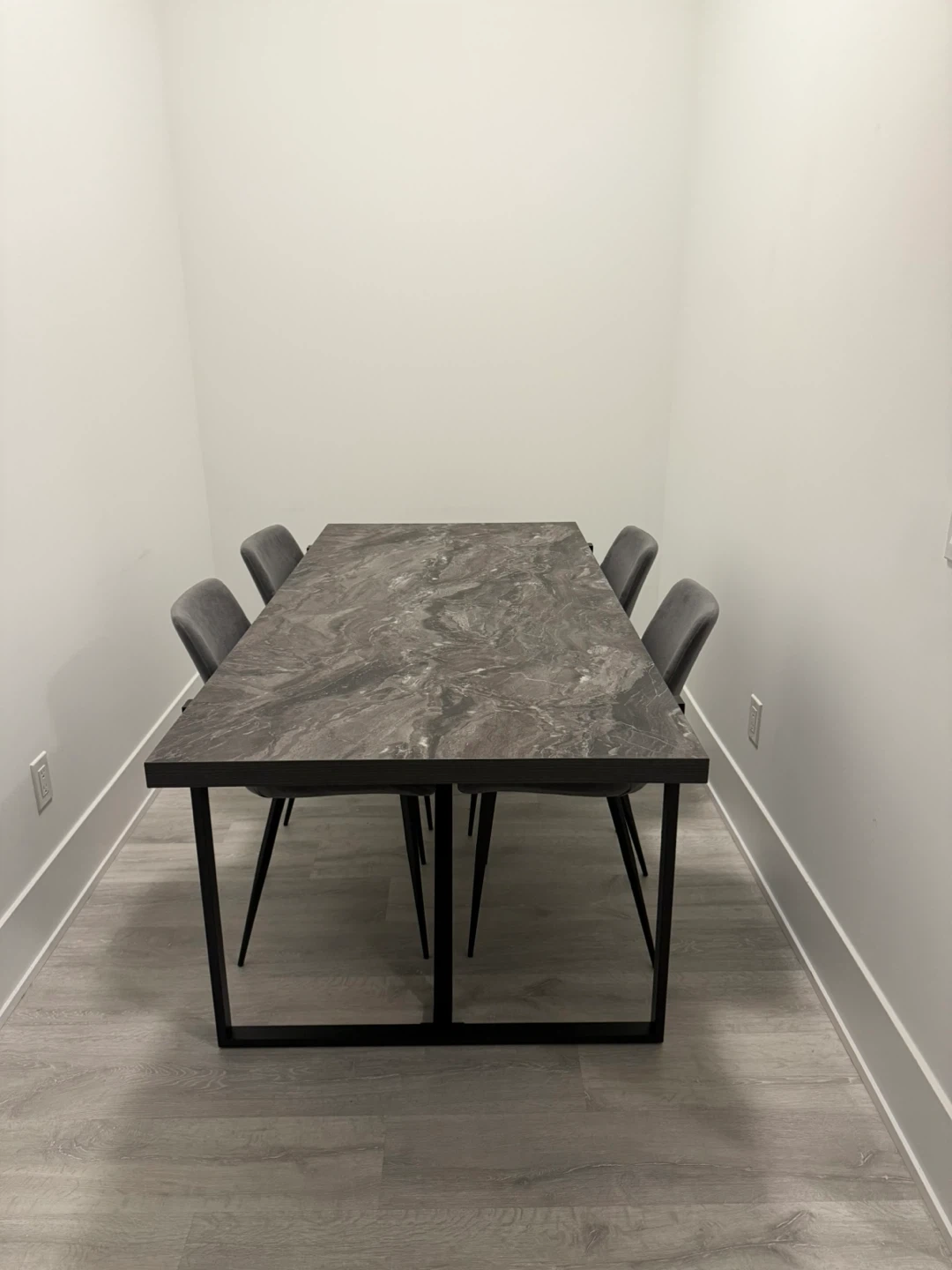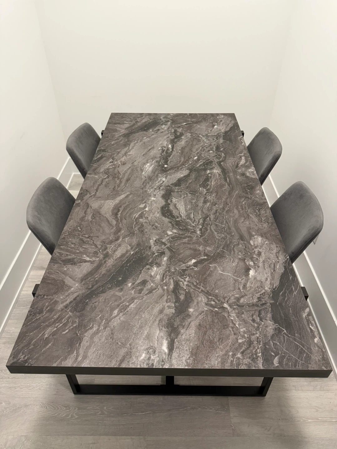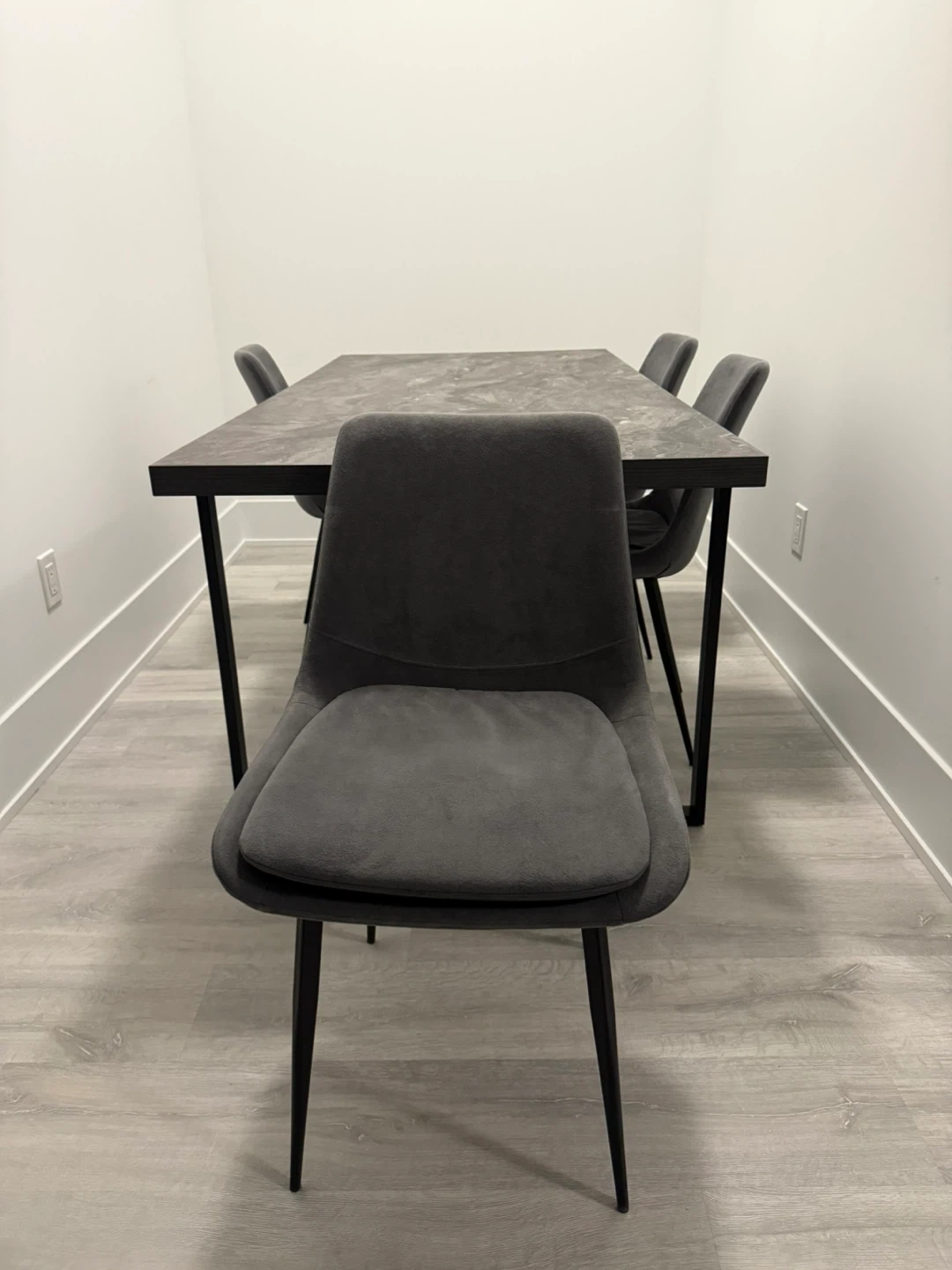Selling this Structube dining table with four chairs. The table has a grey faux marble top and black legs. The chairs are upholstered in a matching grey fabric.