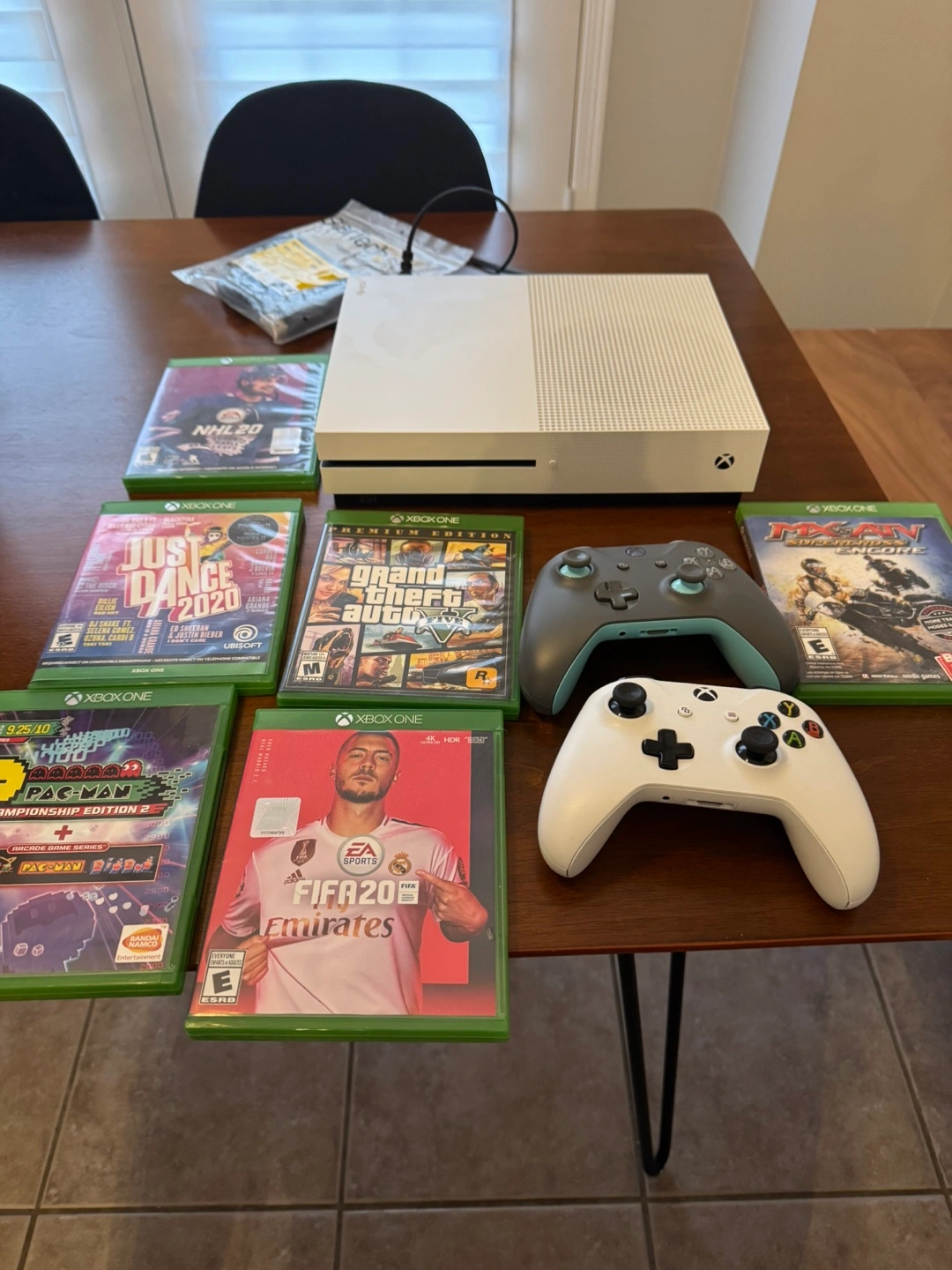 Xbox One S 1TB console, two controllers (one white, one grey), and eight games included. Games include: Grand Theft Auto V, Just Dance 2020, NHL 20, FIFA 20, Pac-Man Championship Edition 2, Star Wars Jedi Fallen Order, and more. Power cord included.