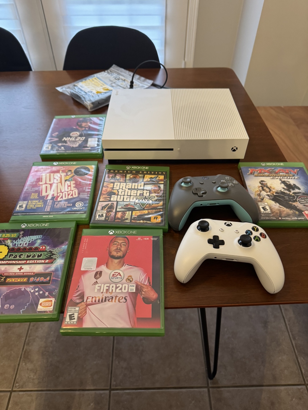 Xbox One S 1TB console, two controllers (one white, one grey), and eight games included. Games include: Grand Theft Auto V, Just Dance 2020, NHL 20, FIFA 20, Pac-Man Championship Edition 2, Star Wars Jedi Fallen Order, and more. Power cord included.