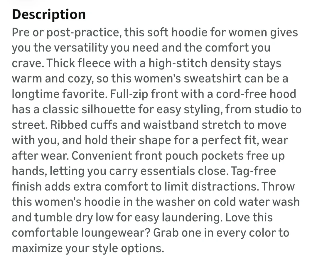 This women's hoodie is made with a thick, cozy fleece in size Large.It features a full-zip front, cord-free hood, and front pouch pockets. Ribbed cuffs and waistband help hold shape for a perfect fit. Machine washable.