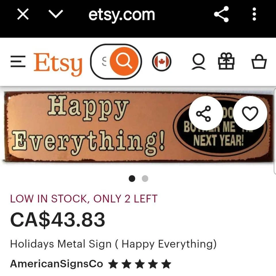 Buy & SellHappy Everything SignHappy Everything Sign$20Pick up Richmond Rd and Pinecrest areaWHERE TO MEETCheck LocationView MapSELLERTraceyWhitehaven100 reviews0 chats·0 favorites·3 viewsSEND CHAT TO SELLERHi Tracey! I’m interested in your listing.Hi Tracey! I’m interested in your listing.Get the Karrot app to chatSign In to chat