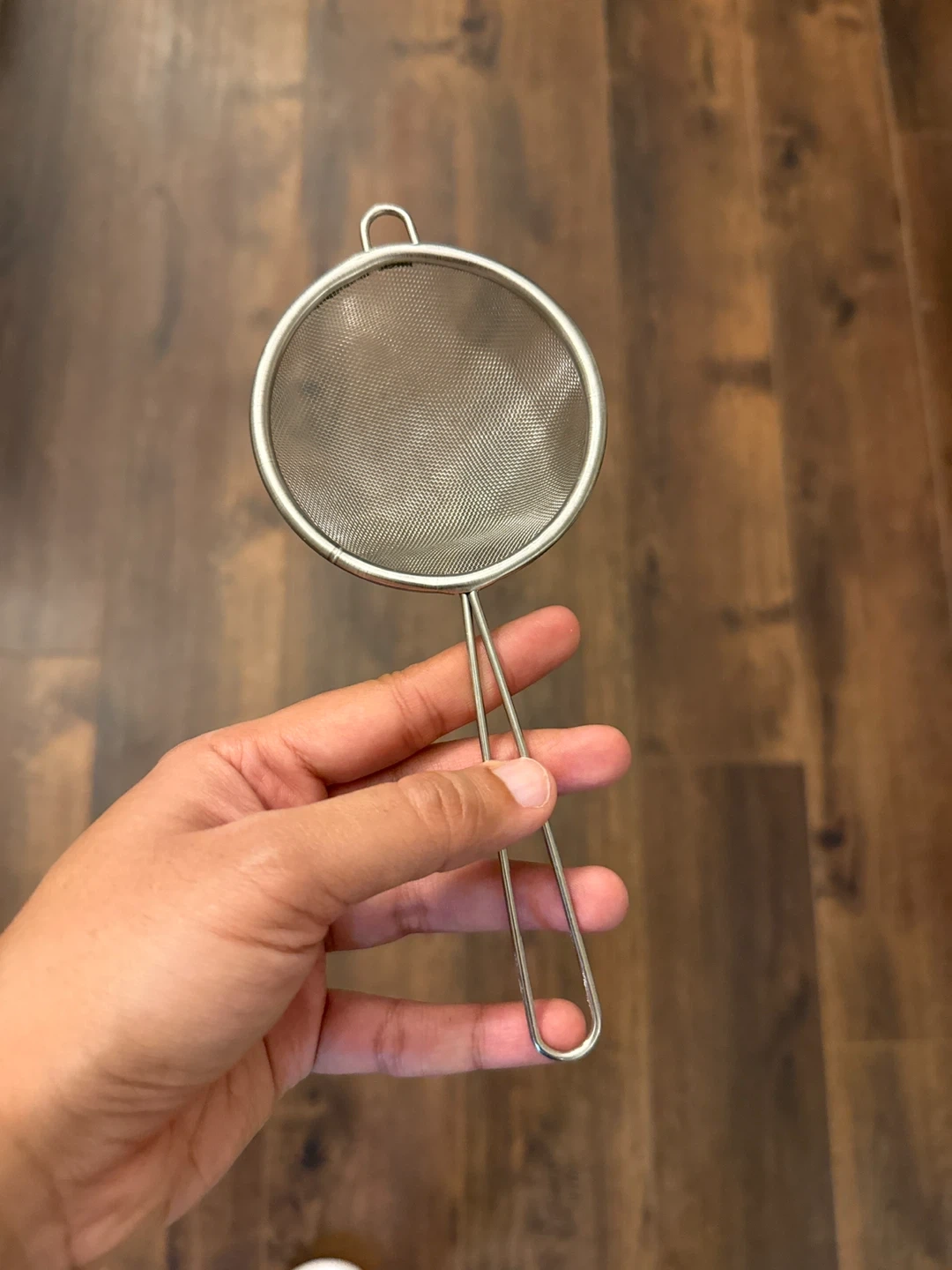 This is a fine mesh strainer with a stainless steel construction. It has a comfortable handle and a hook for hanging. It's great for sifting dry ingredients or straining liquids.