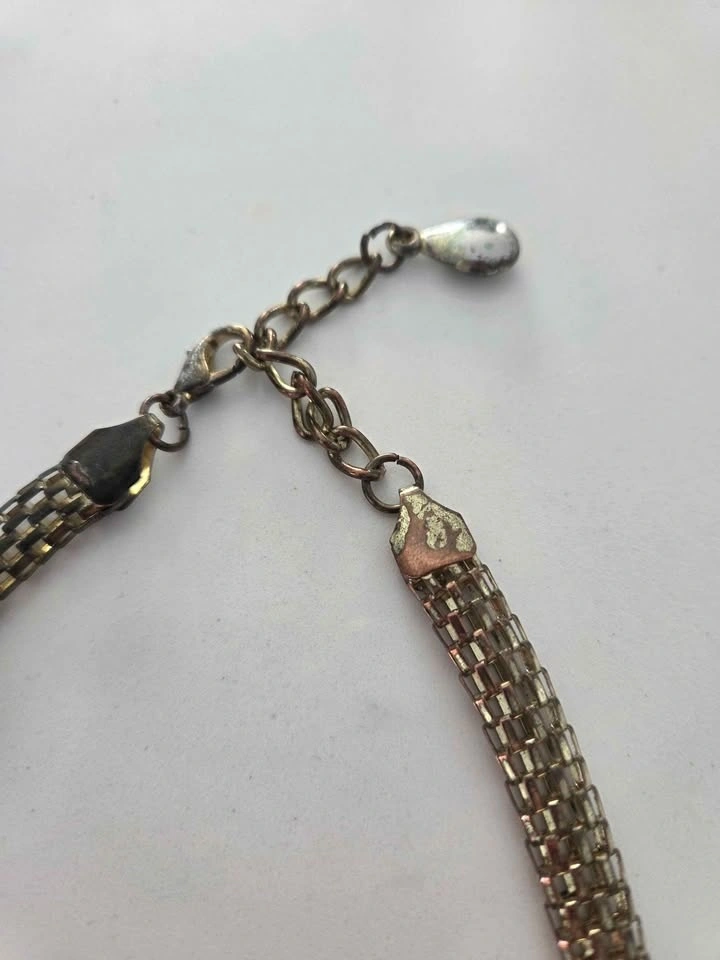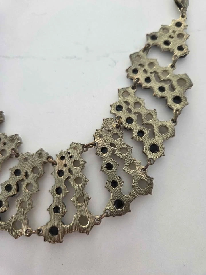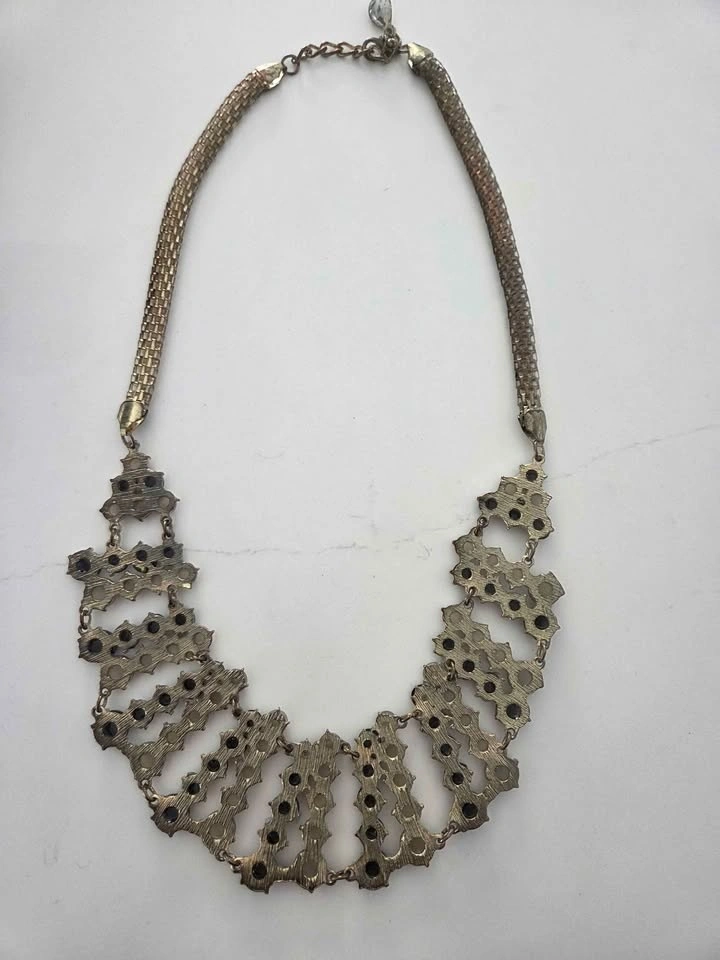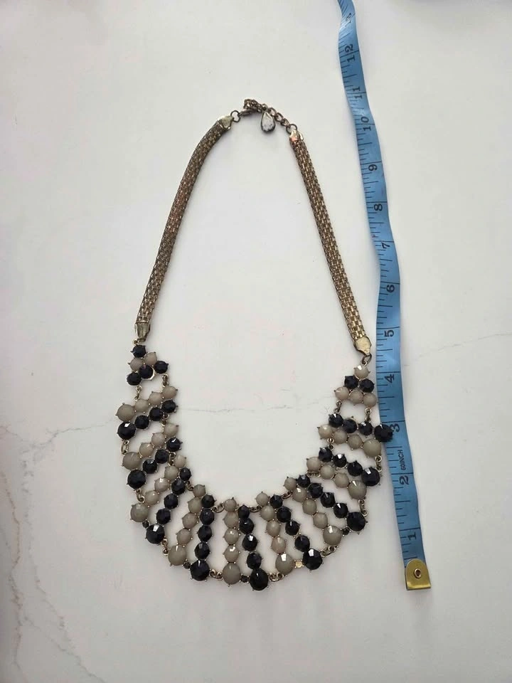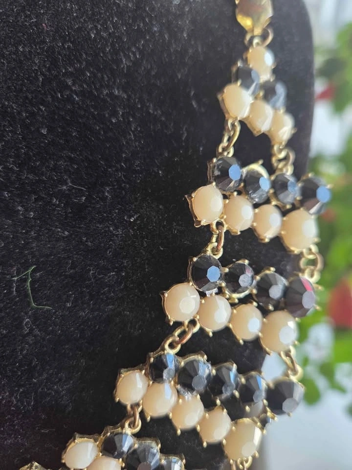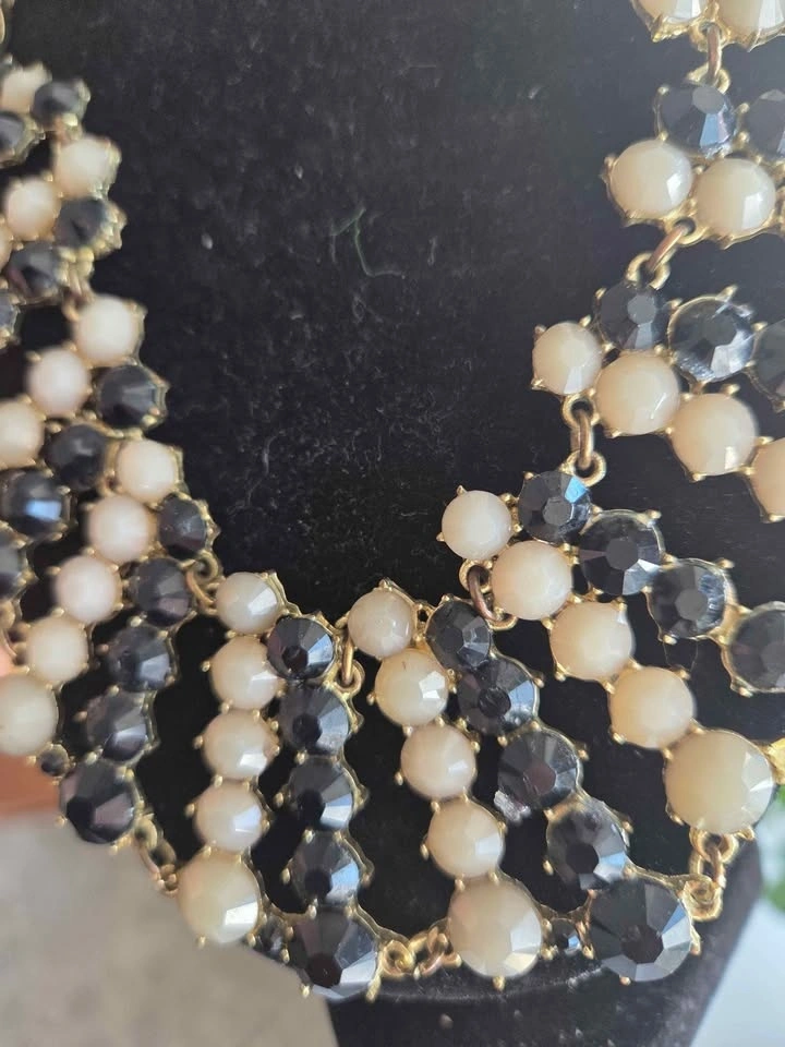 Beautiful vintage statement collar necklace with a layered bib design. Features black and ivory-tone faceted beads linked with gold-tone metal. Bold yet elegant, perfect for special occasions or dressing up a simple outfit. Excellent pre-owned condition, some gentle wear.on the chain, see pics