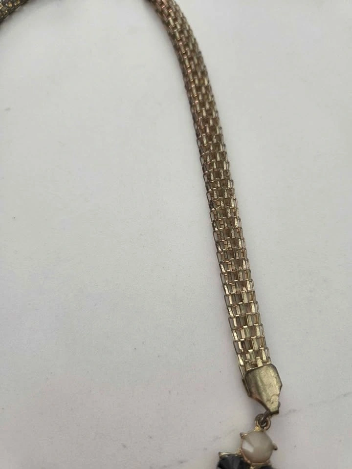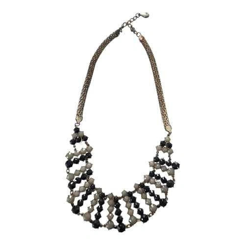 Beautiful vintage statement collar necklace with a layered bib design. Features black and ivory-tone faceted beads linked with gold-tone metal. Bold yet elegant, perfect for special occasions or dressing up a simple outfit. Excellent pre-owned condition, some gentle wear.on the chain, see pics