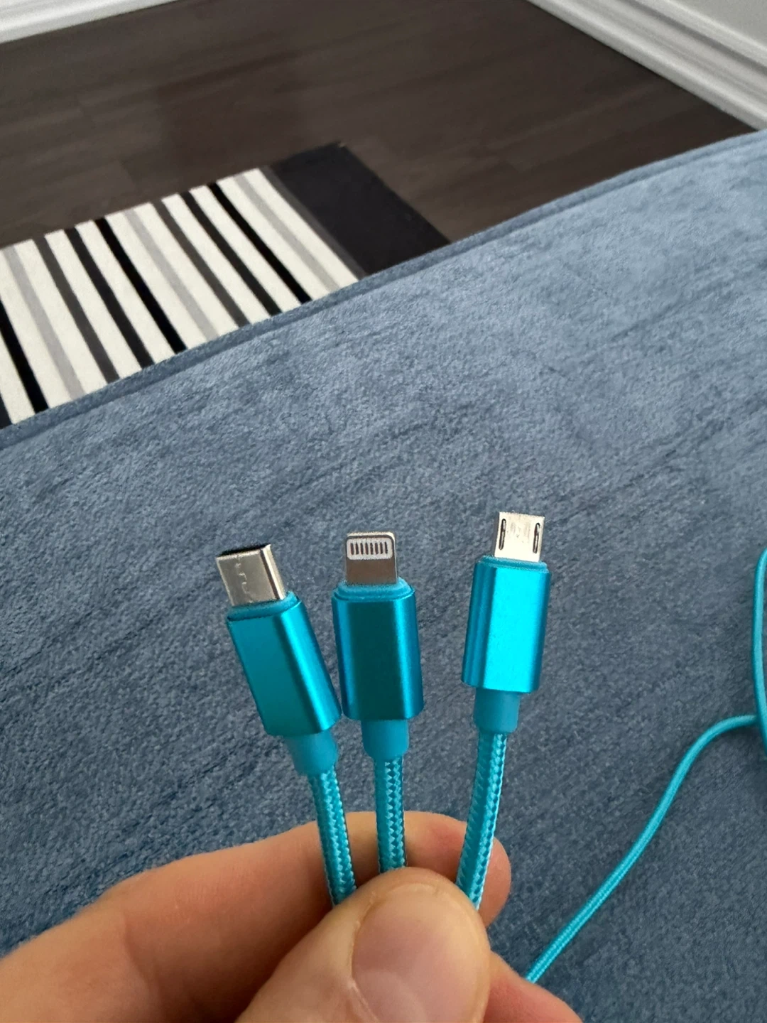 This is a handy 3-in-1 charging cable, perfect for keeping all your devices powered up. It comes with USB-C, Lightning, and Micro USB connectors all in one braided cord. This cable is great for travel or for reducing clutter by consolidating multiple chargers into one. The braided exterior makes it durable! 6 ft long !