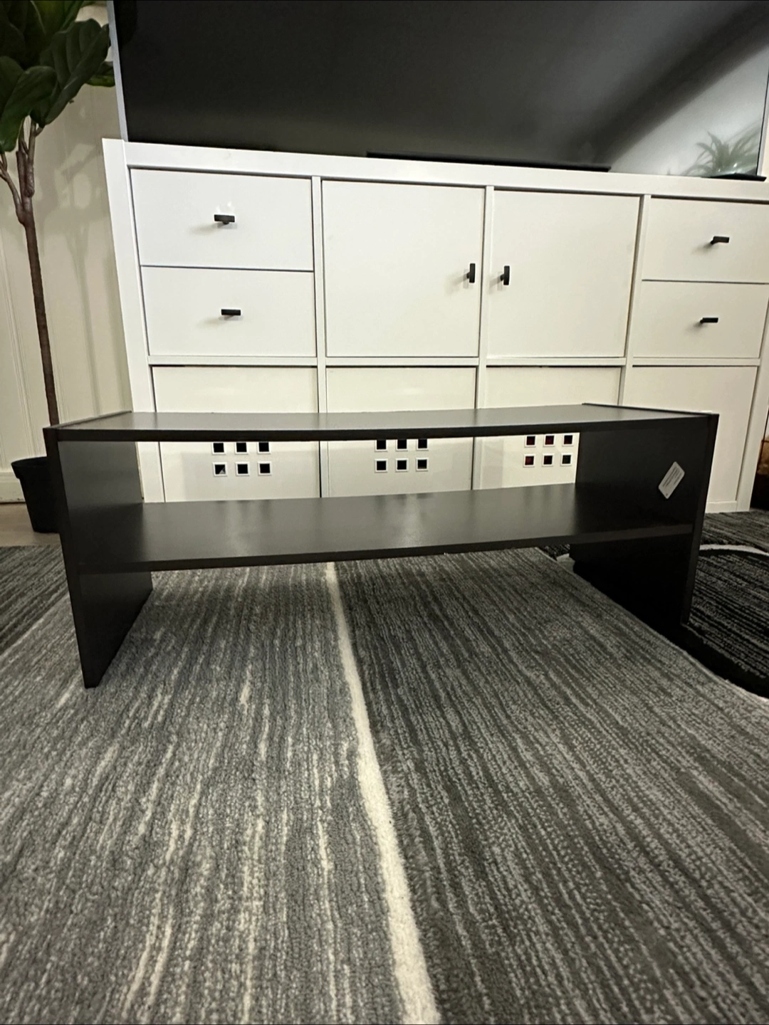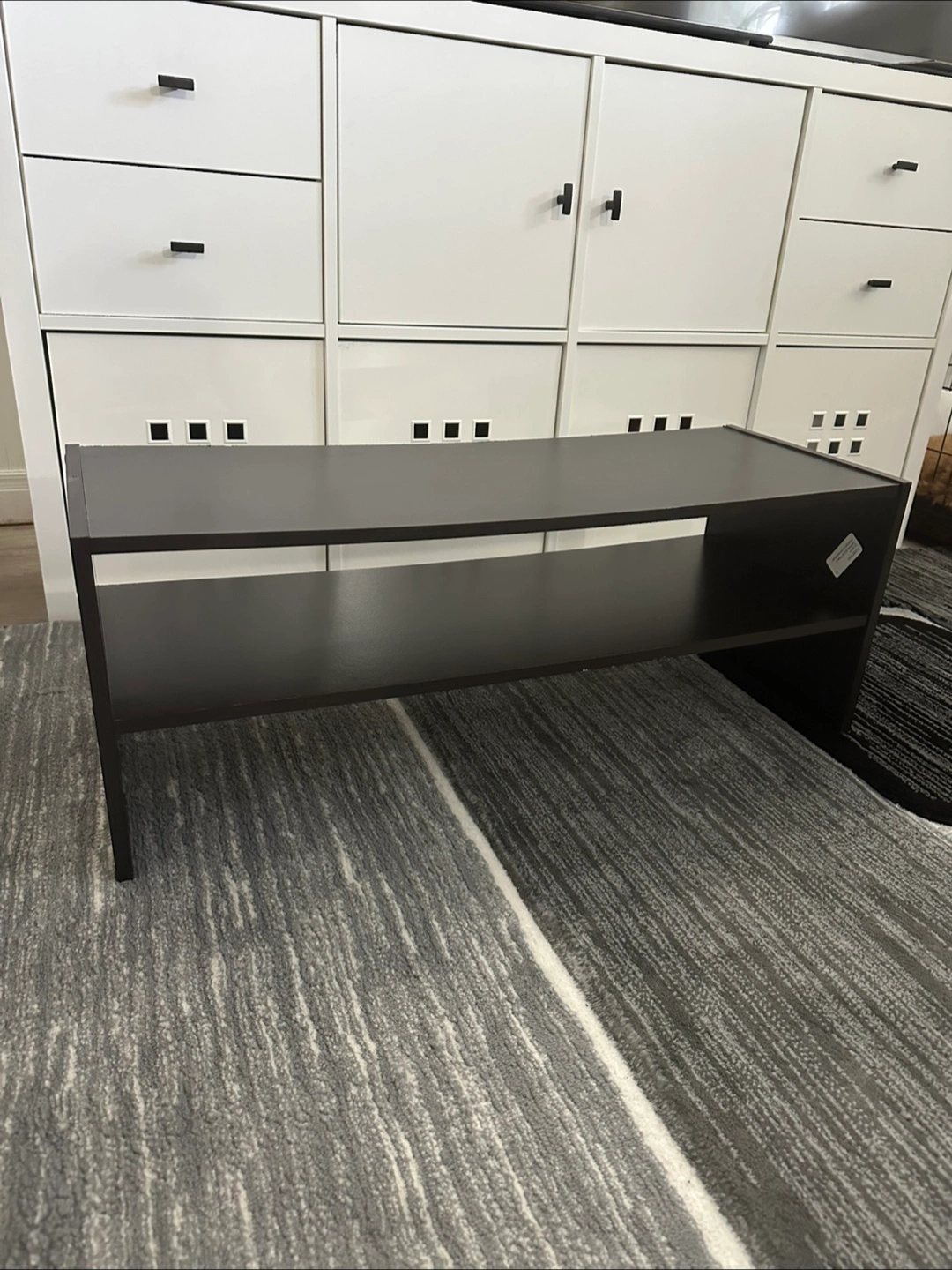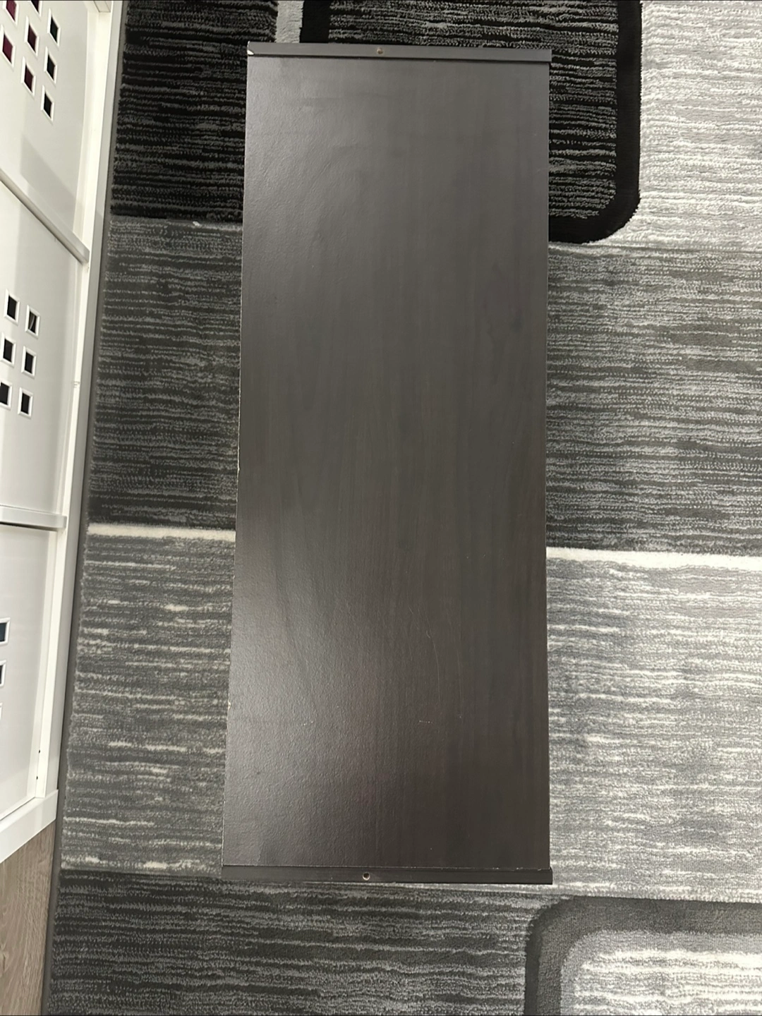 Black/brown shoe shelf. Two shelves, simple design. Good for storage or display.