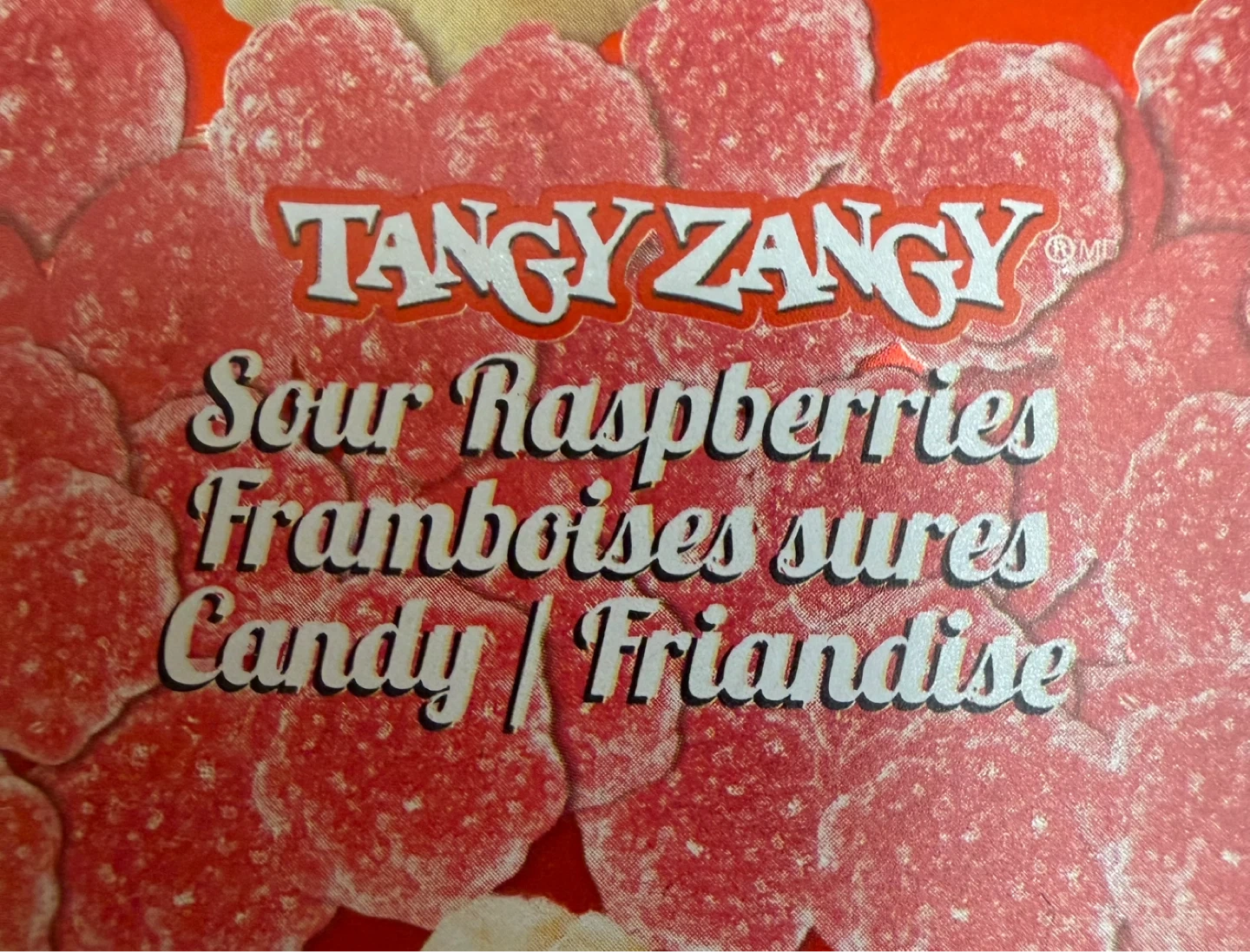 Tangy Zangy Sour Raspberries candy. Sealed. Expiry date is November 30, 2026. These are a sweet and sour treat!