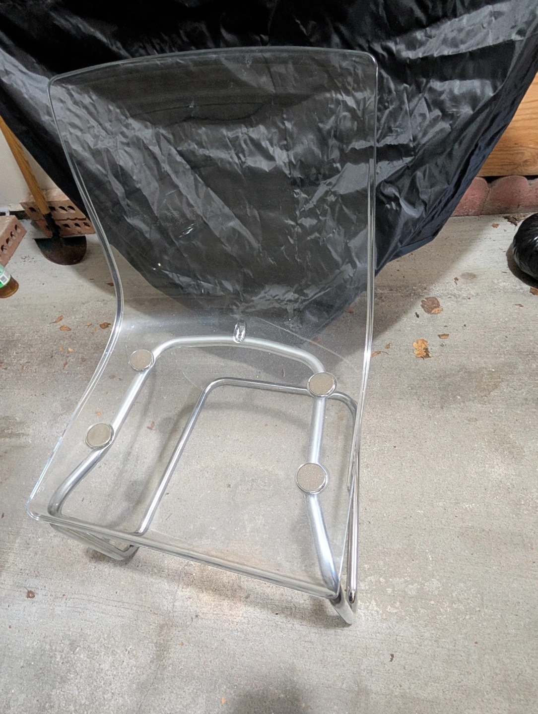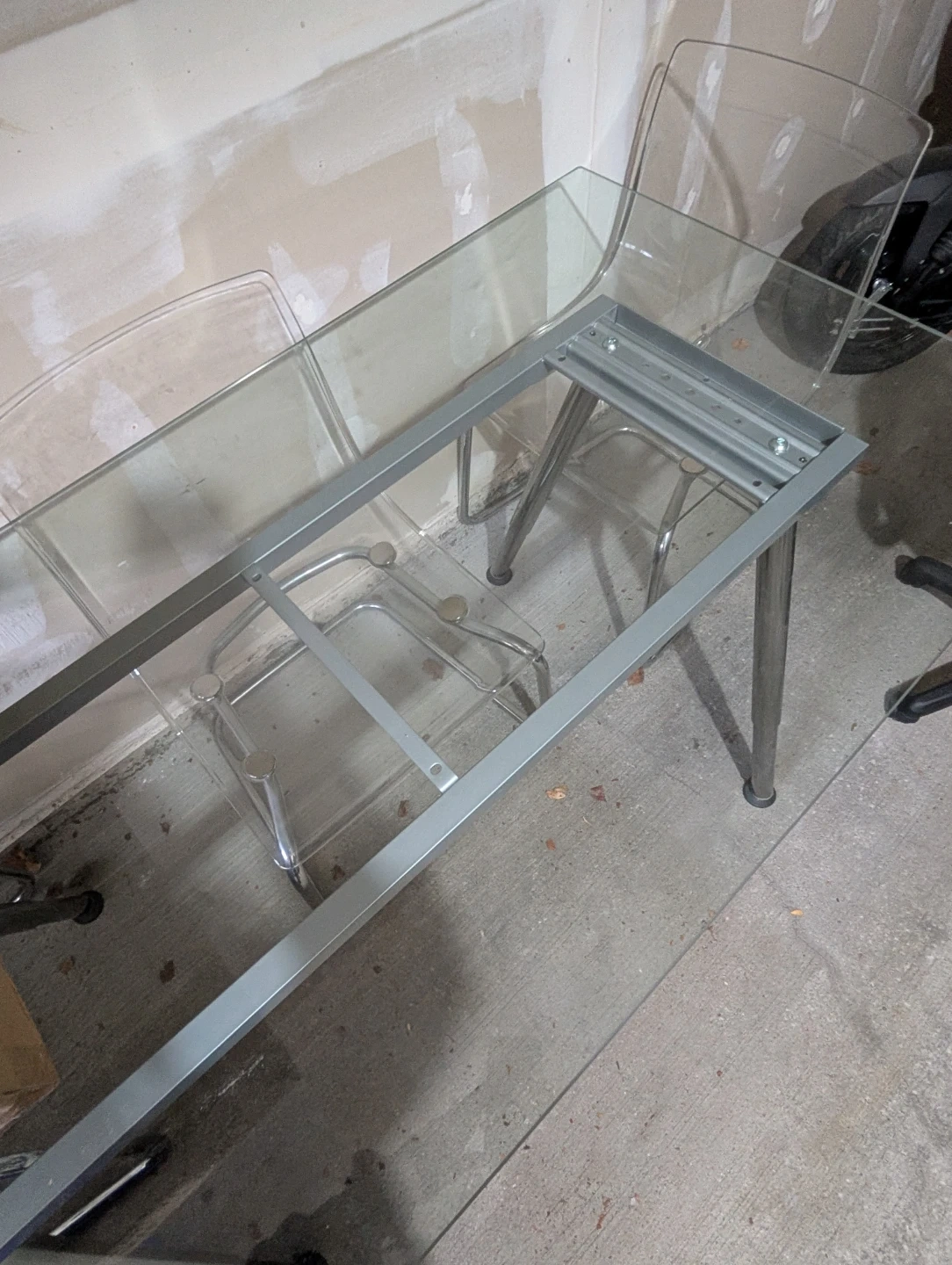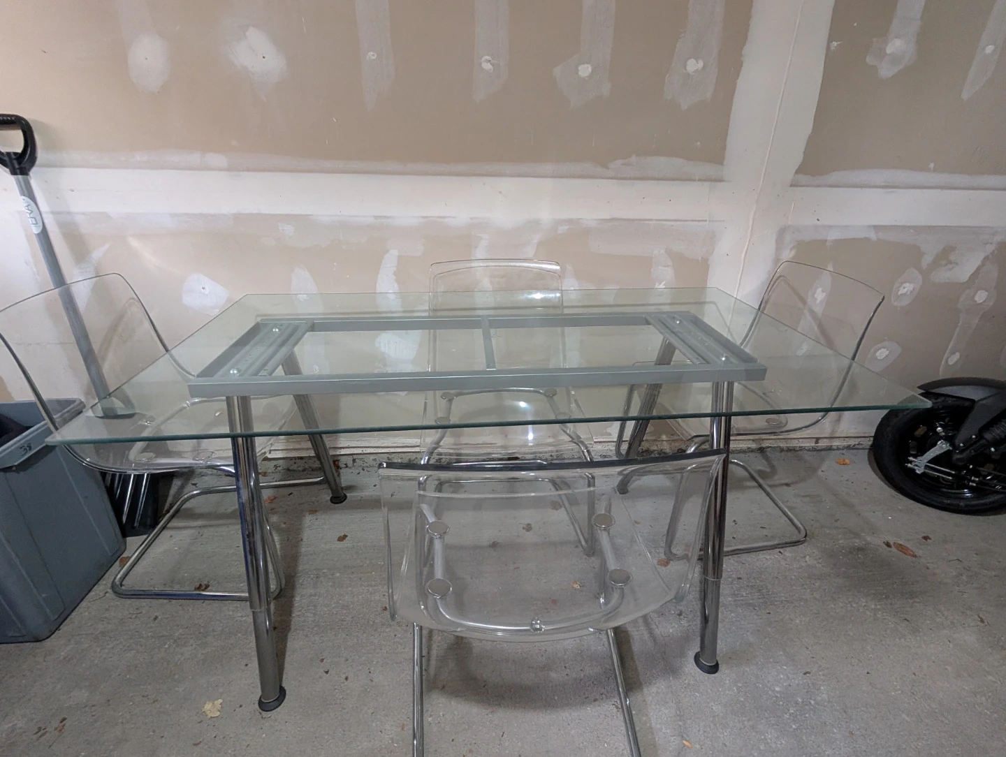 This glass dining table comes with four clear acrylic chairs. It's a modern set with a chrome and glass design. The table has a sturdy metal frame.