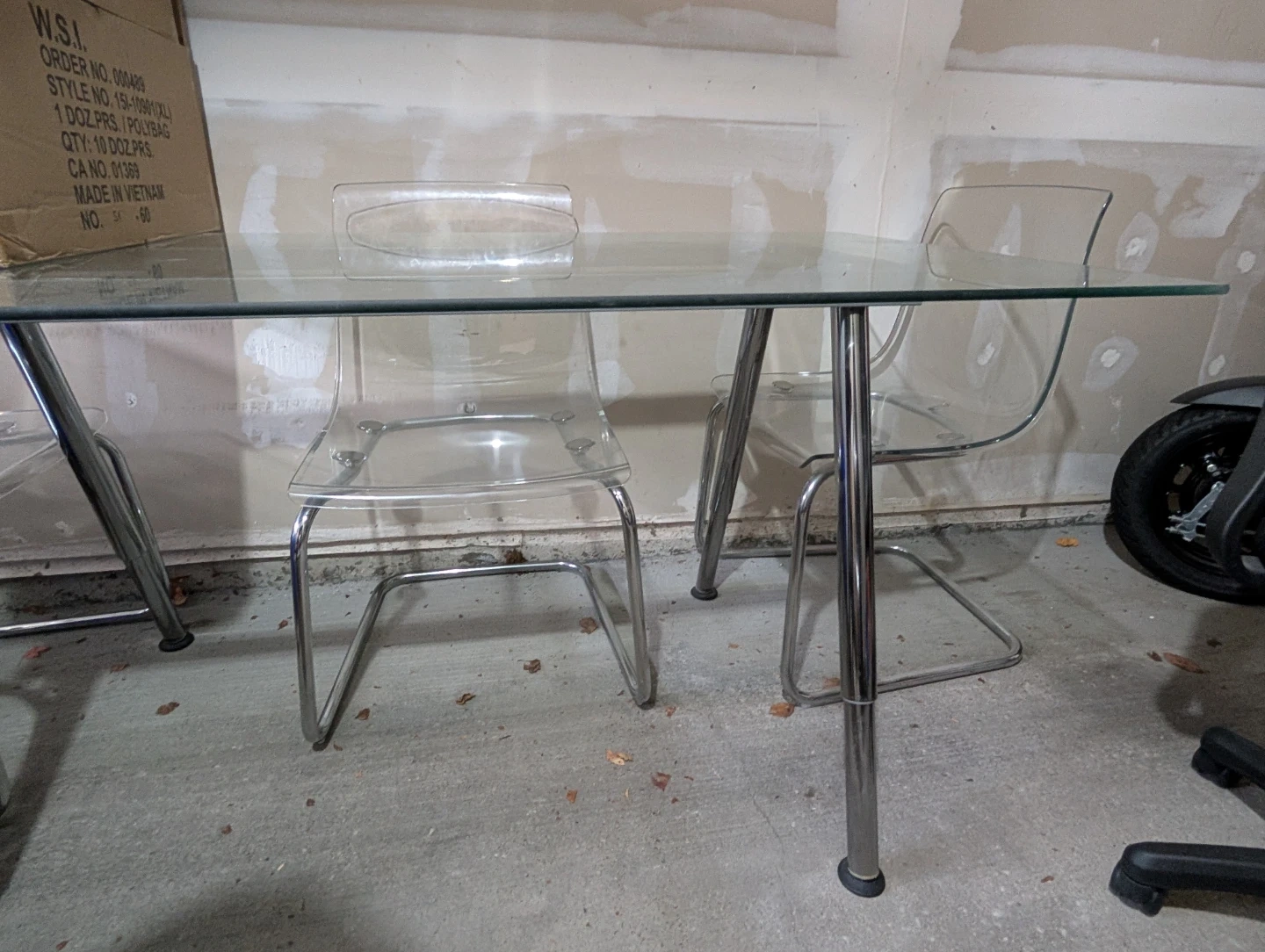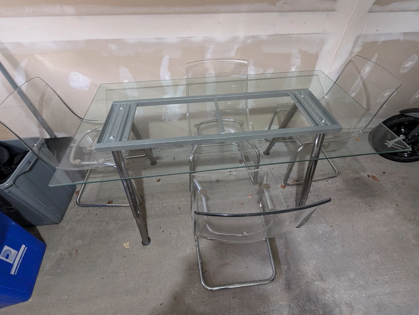 This glass dining table comes with four clear acrylic chairs. It's a modern set with a chrome and glass design. The table has a sturdy metal frame.