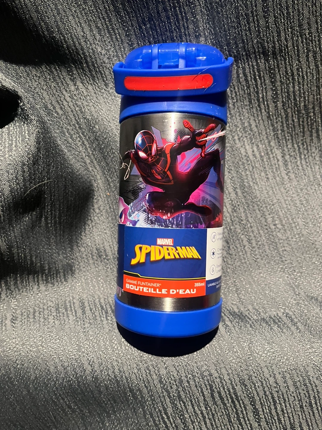 Stainless steel water bottle featuring Spiderman graphics. It has a blue lid with a pop-up straw and a blue base. Holds 12oz (355ml). Great for kids' lunches or outings!