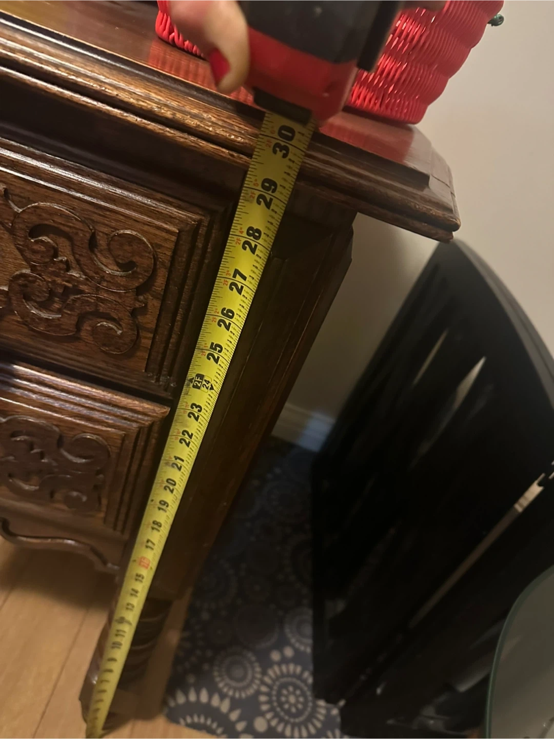 This is a beautiful solid wood desk with intricate carvings. It features multiple drawers for storage, and its classic design adds elegance to any room. The desk has a width of approximately 50 inches and a height of around 30 inches.