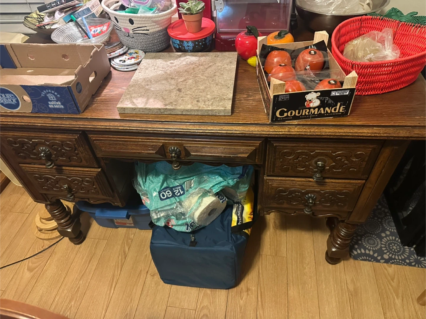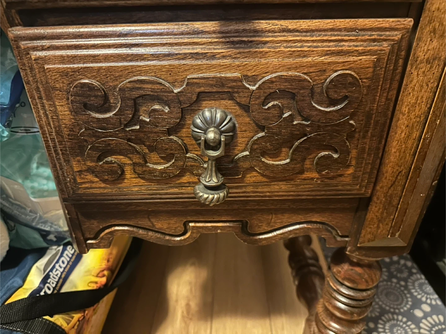 This is a beautiful solid wood desk with intricate carvings. It features multiple drawers for storage, and its classic design adds elegance to any room. The desk has a width of approximately 50 inches and a height of around 30 inches.