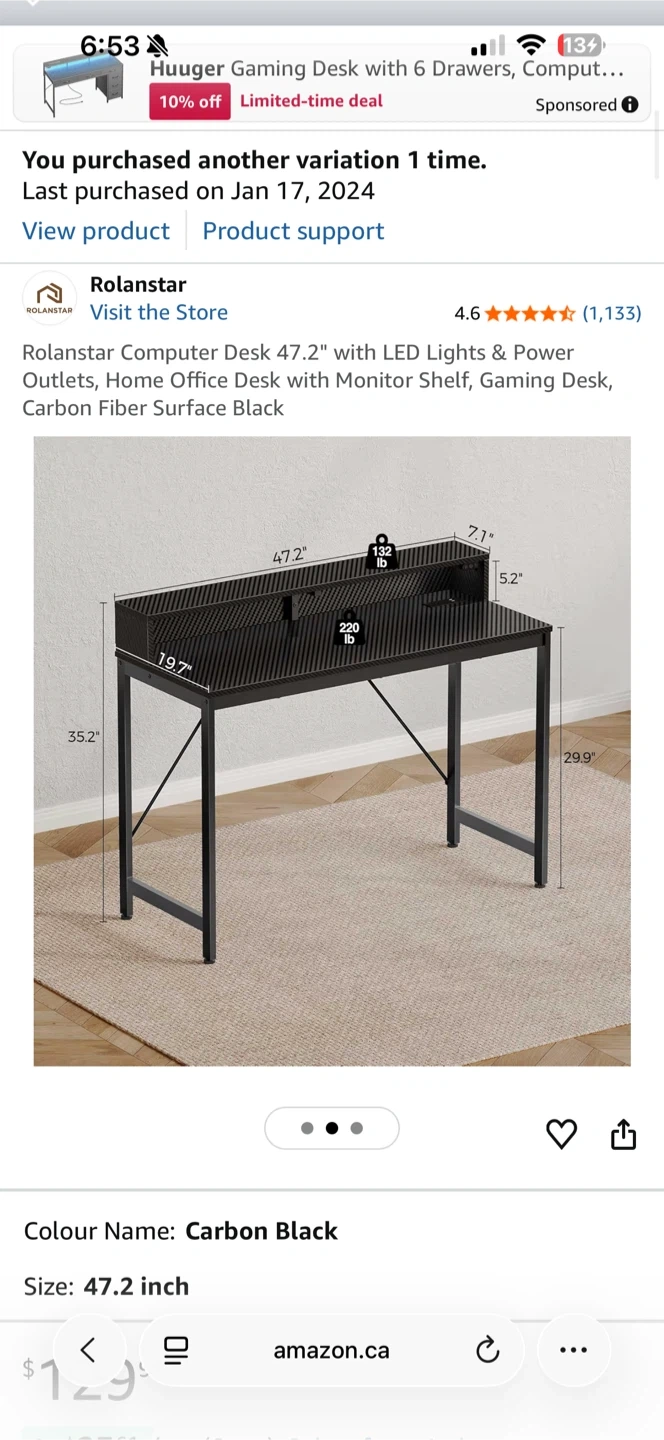 This Rolynstar computer desk is 47.2 inches wide and features built-in LED lights and power outlets. It's designed as a home office or gaming desk with a carbon fiber surface. The desk has a monitor shelf and a height of 35.2 inches.