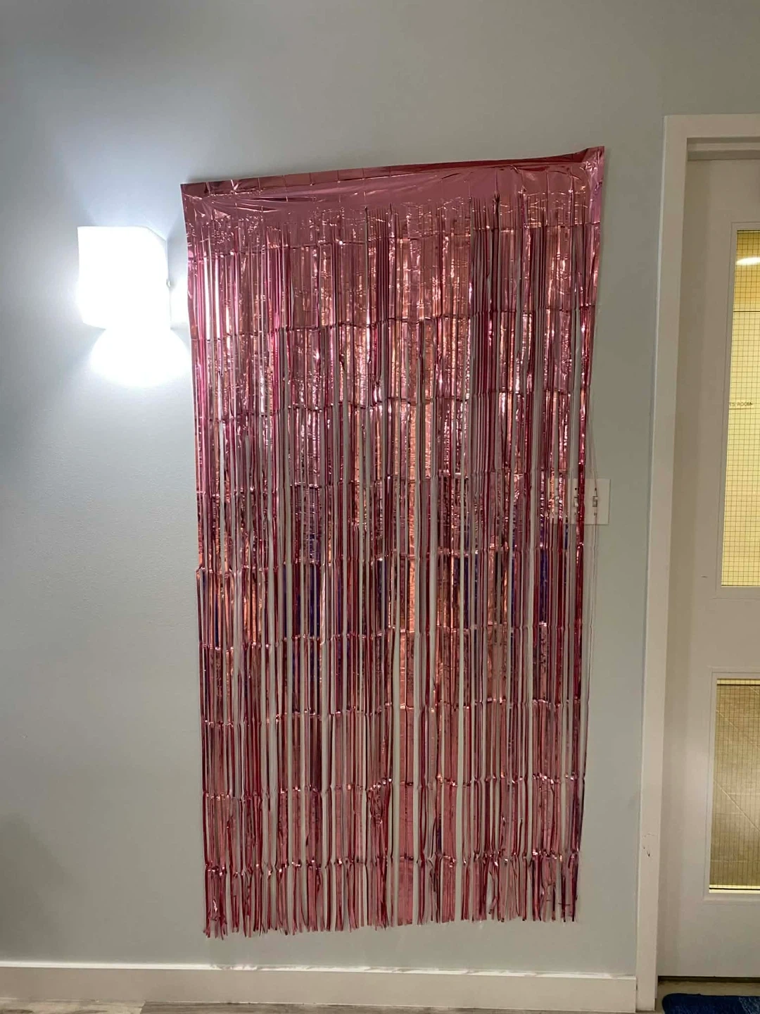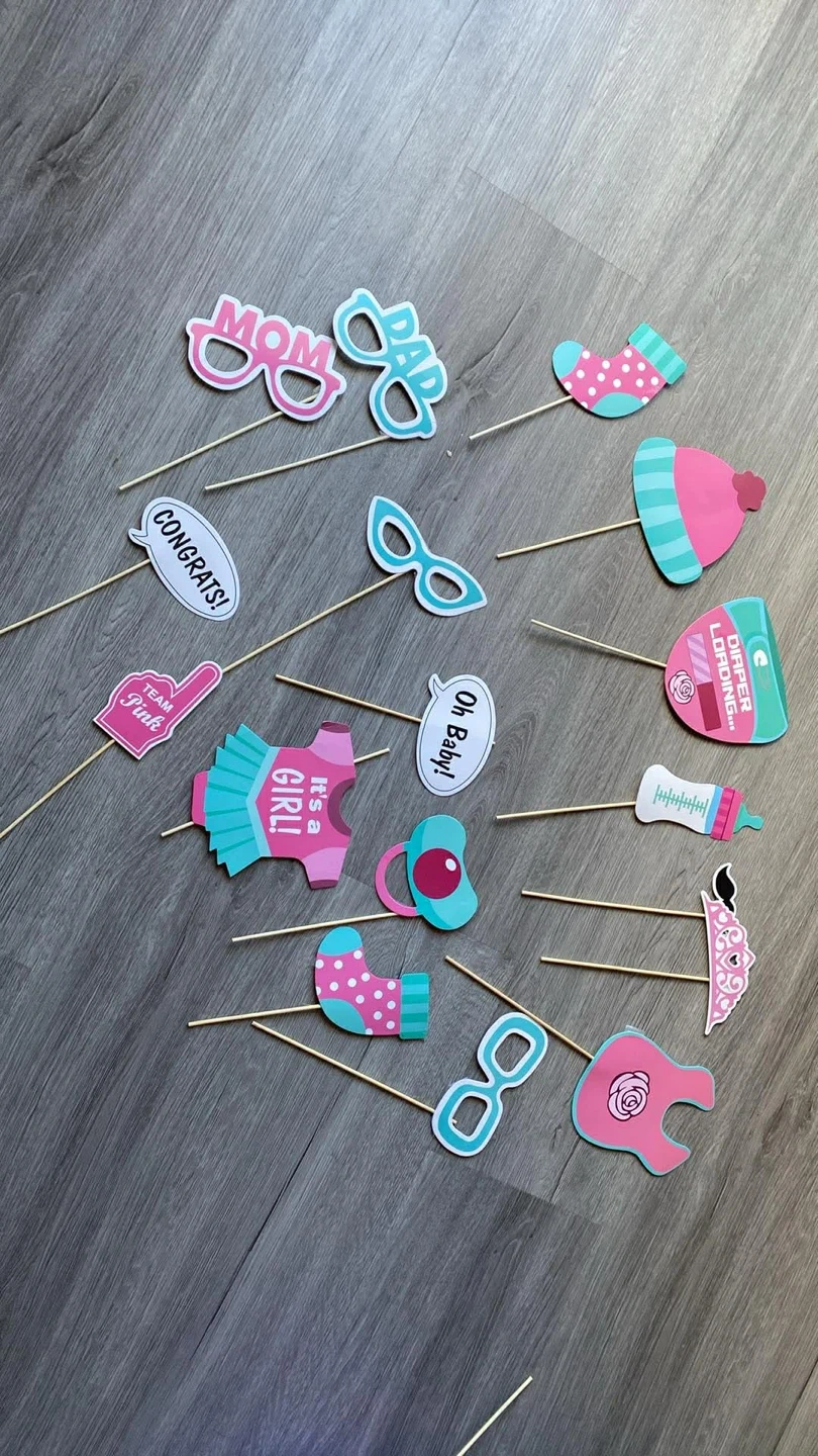 This set includes a pink fringe curtain backdrop and a collection of fun photo booth props for a baby shower. Props include "Mom", "Dad", "It's a Girl", "Oh Baby", a pacifier, baby bottles, and more. Perfect for capturing memories at your celebration!