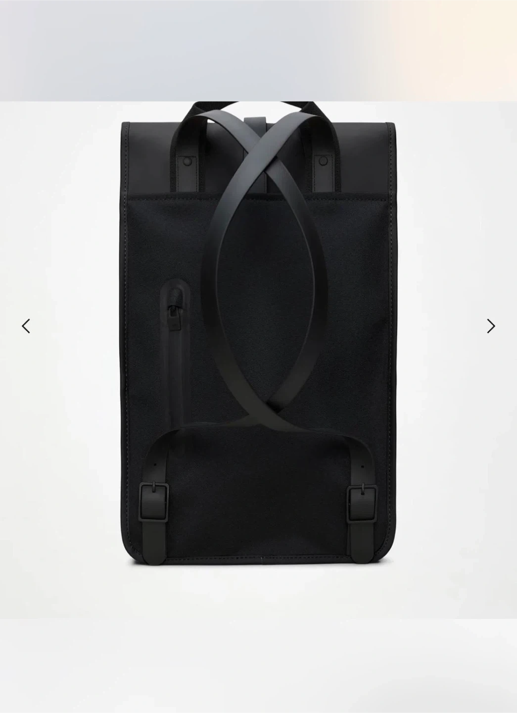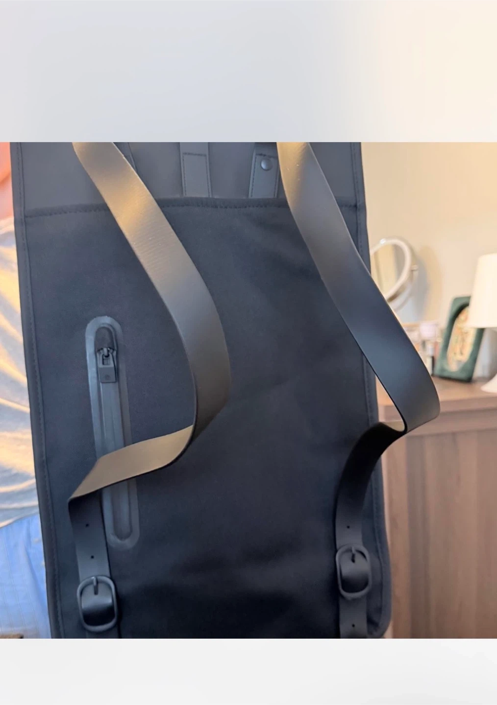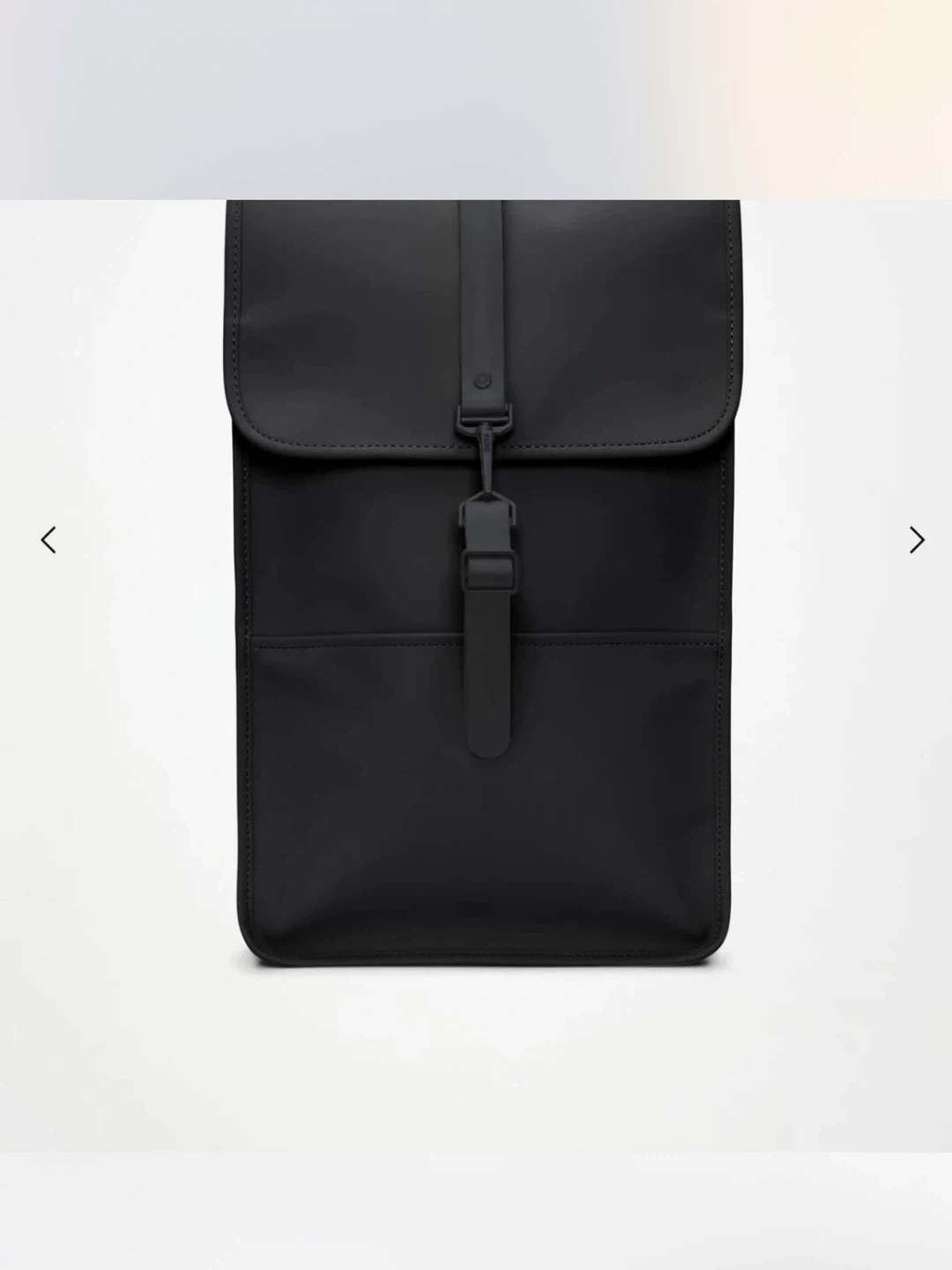 This is a black Rains backpack. It's made of waterproof material and has adjustable straps. Includes a laptop sleeve and internal pouches for organization.