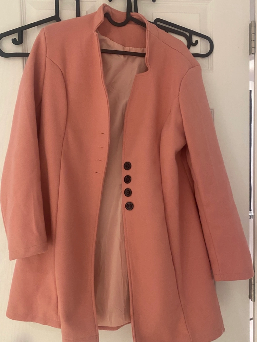 Women's long-sleeve peacoat. Dusty rose colour. Features a mandarin collar and three buttons. Fits a small, size 4-6.