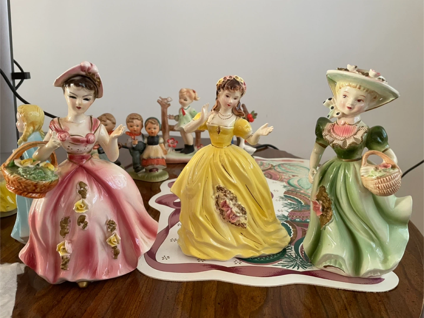Selling a set of vintage porcelain figurines. They feature women in elegant dresses, each with unique details and colours. They would make a lovely addition to any collection or a charming decorative piece for your home