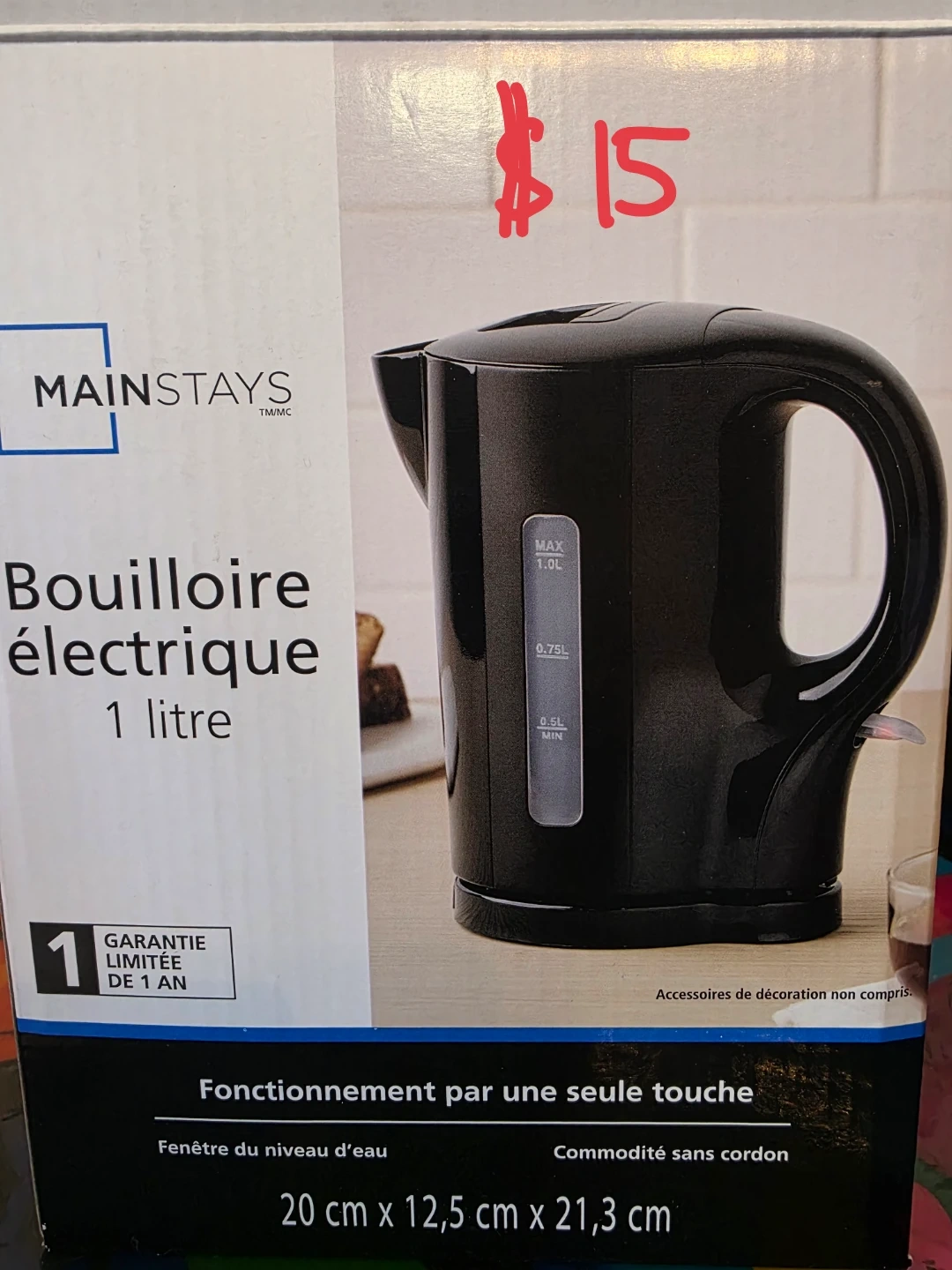 Selling a Mainstays electric kettle with a 1-litre capacity! It's in great condition and comes in its original box. It features one-touch operation and a cordless design for convenience. The kettle also has a water level window and measures 20 cm x 12.5 cm x 21.3 cm