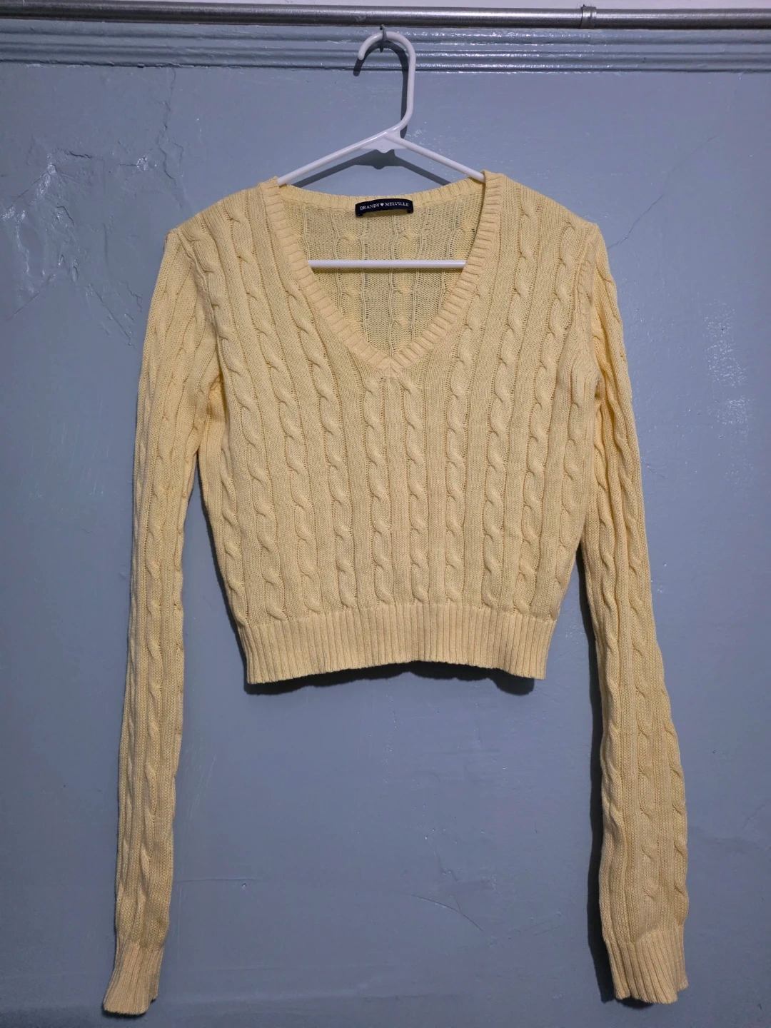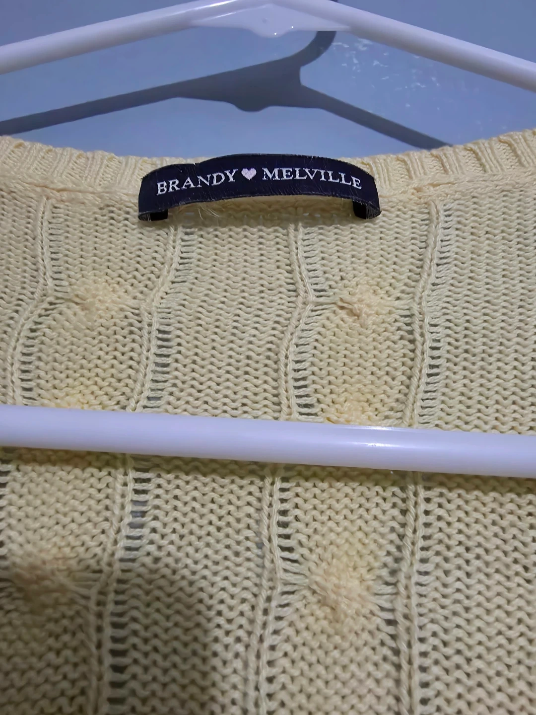 Buy & SellBrandy Melville Yellow Cable Knit Cropped SweaterBrandy Melville Yellow Cable Knit Cropped Sweater$8Yellow Brandy Melville cable knit cropped sweater. It's a V-neck style. Material is soft and comfortable. One size.ConditionLike newWHERE TO MEETChinatown BD TrainView MapSELLERverifiedHelenChinatown25812 reviews0 chats·0 favorites·3 viewsSEND CHAT TO SELLERHi Helen! I’m interested in your listing.Hi Helen! I’m interested in your listing.Get the Karrot app to chatSign In to chat