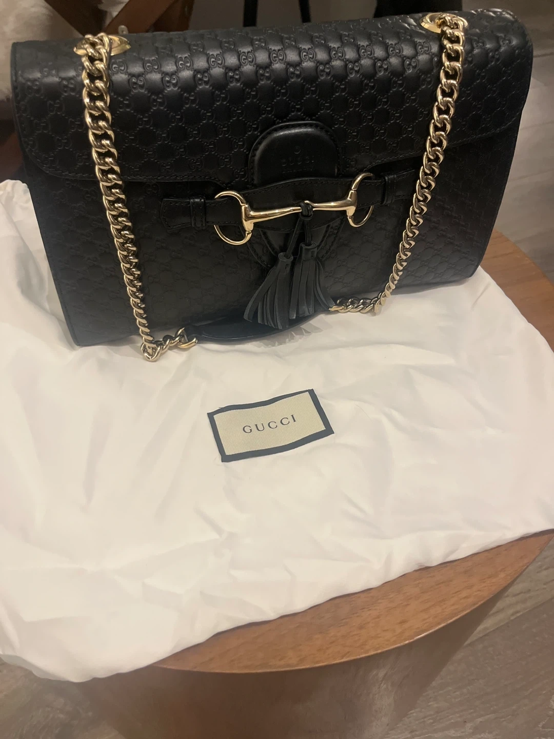This is a black leather Gucci shoulder bag with gold hardware. It features the iconic GG monogram embossed all over the leather. The bag also has a tassel detail and a chain strap.