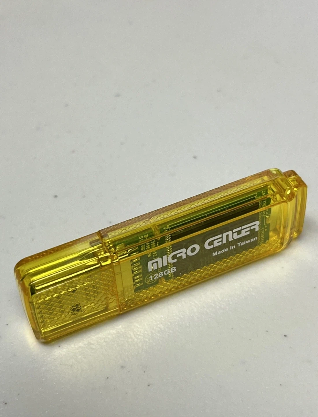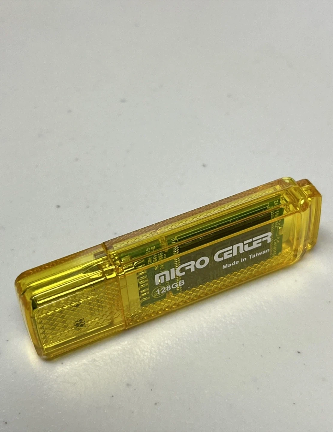 This Micro Center USB flash drive offers 128GB of storage. It's yellow and made in Taiwan. It's a convenient way to transfer or back up files!