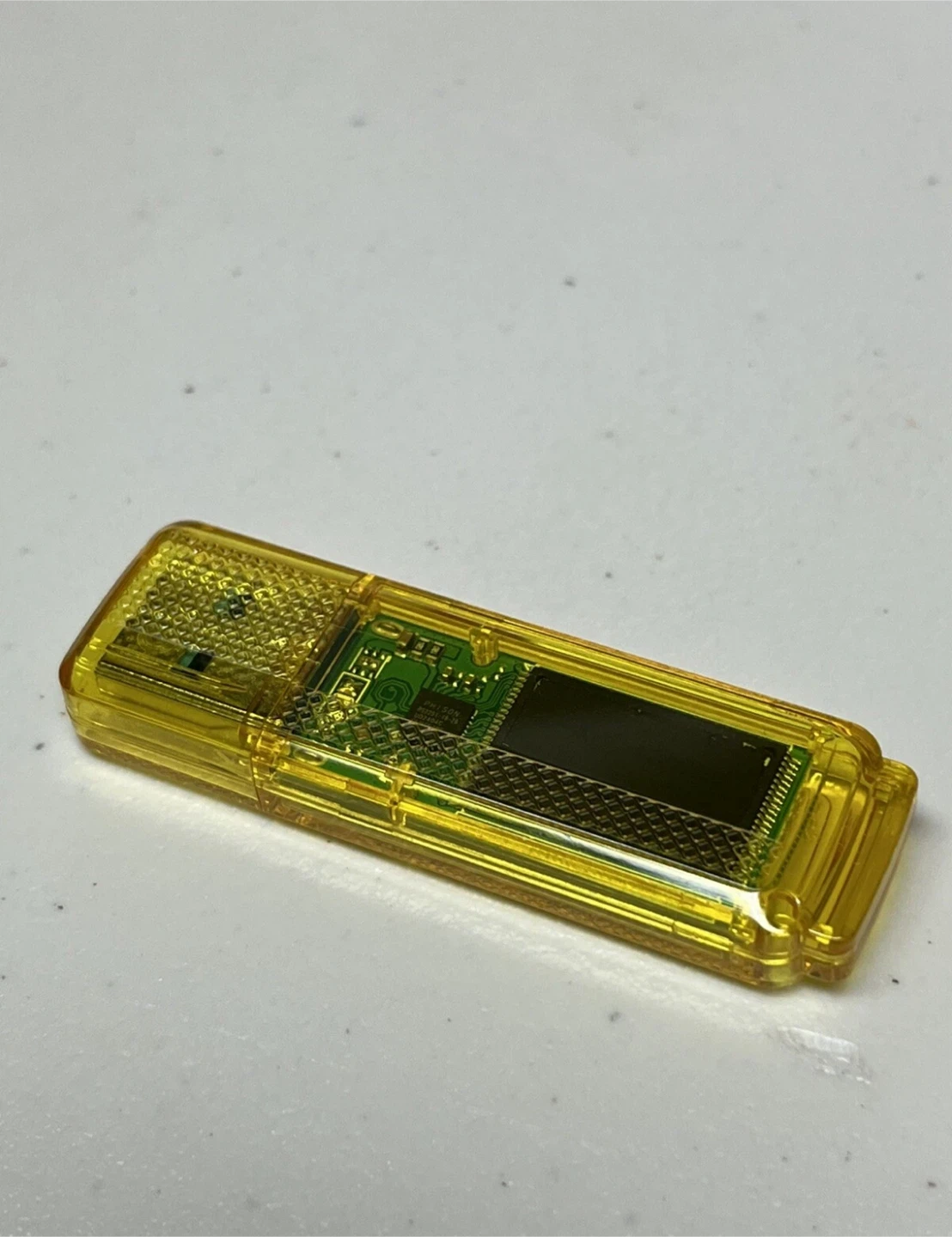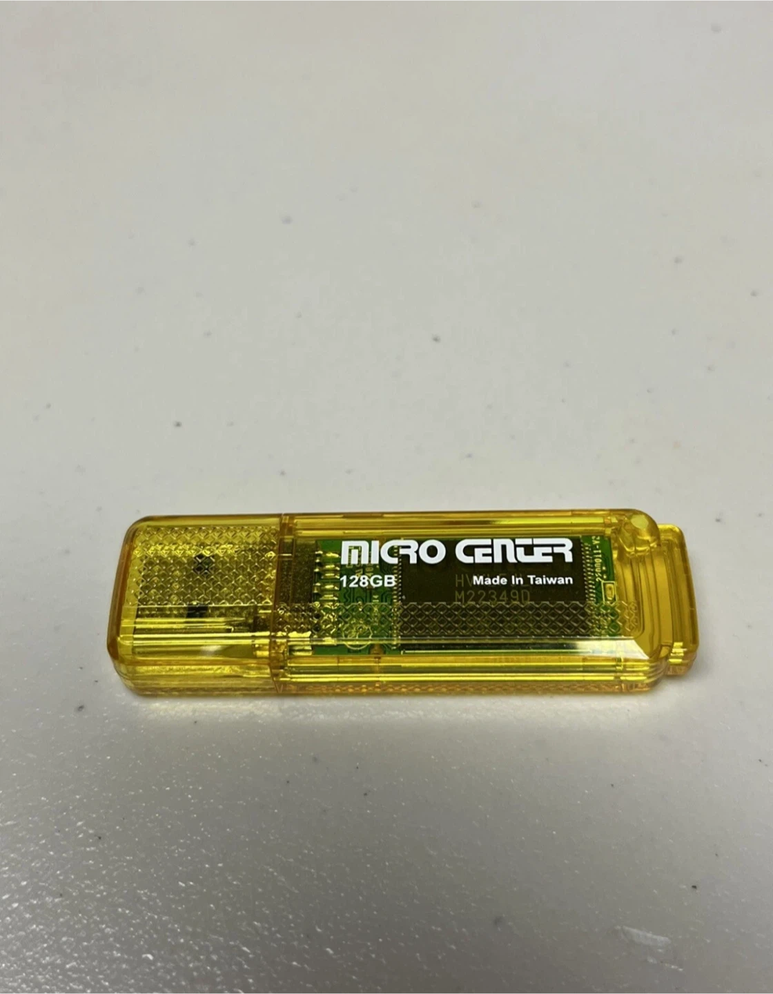 This Micro Center USB flash drive offers 128GB of storage. It's yellow and made in Taiwan. It's a convenient way to transfer or back up files!