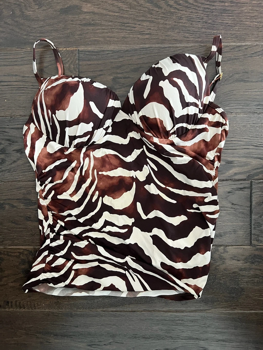 This La Blanca tankini top features a brown and white zebra print. It's made with 80% nylon and 20% elastane for the self fabric, and 84% nylon with 16% elastane for the lining. Size 14.