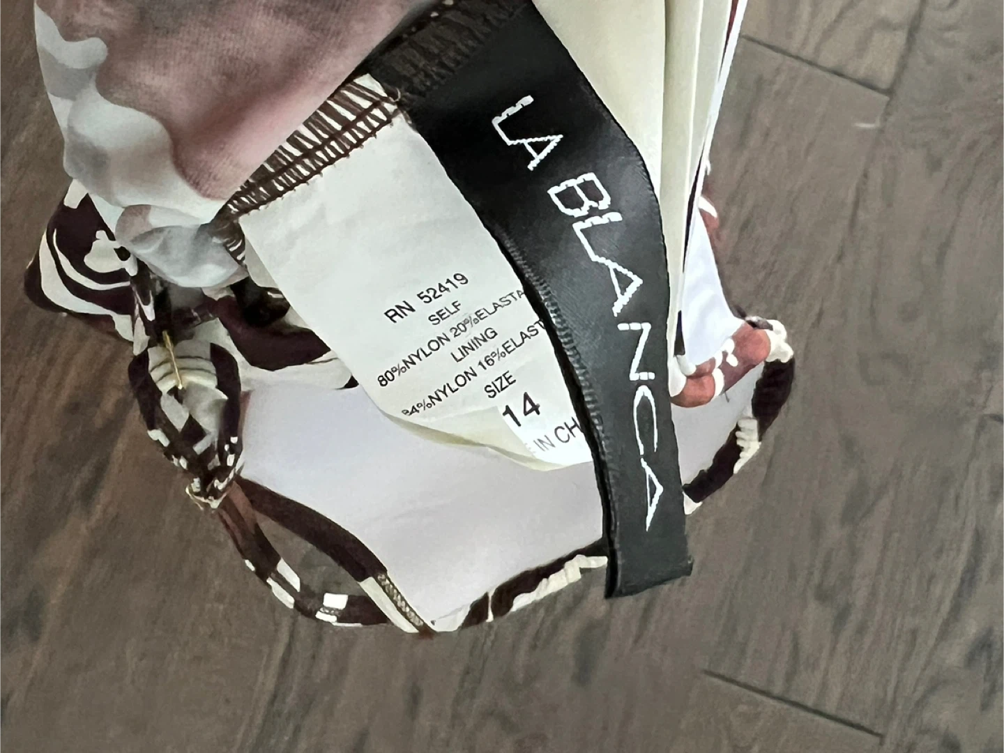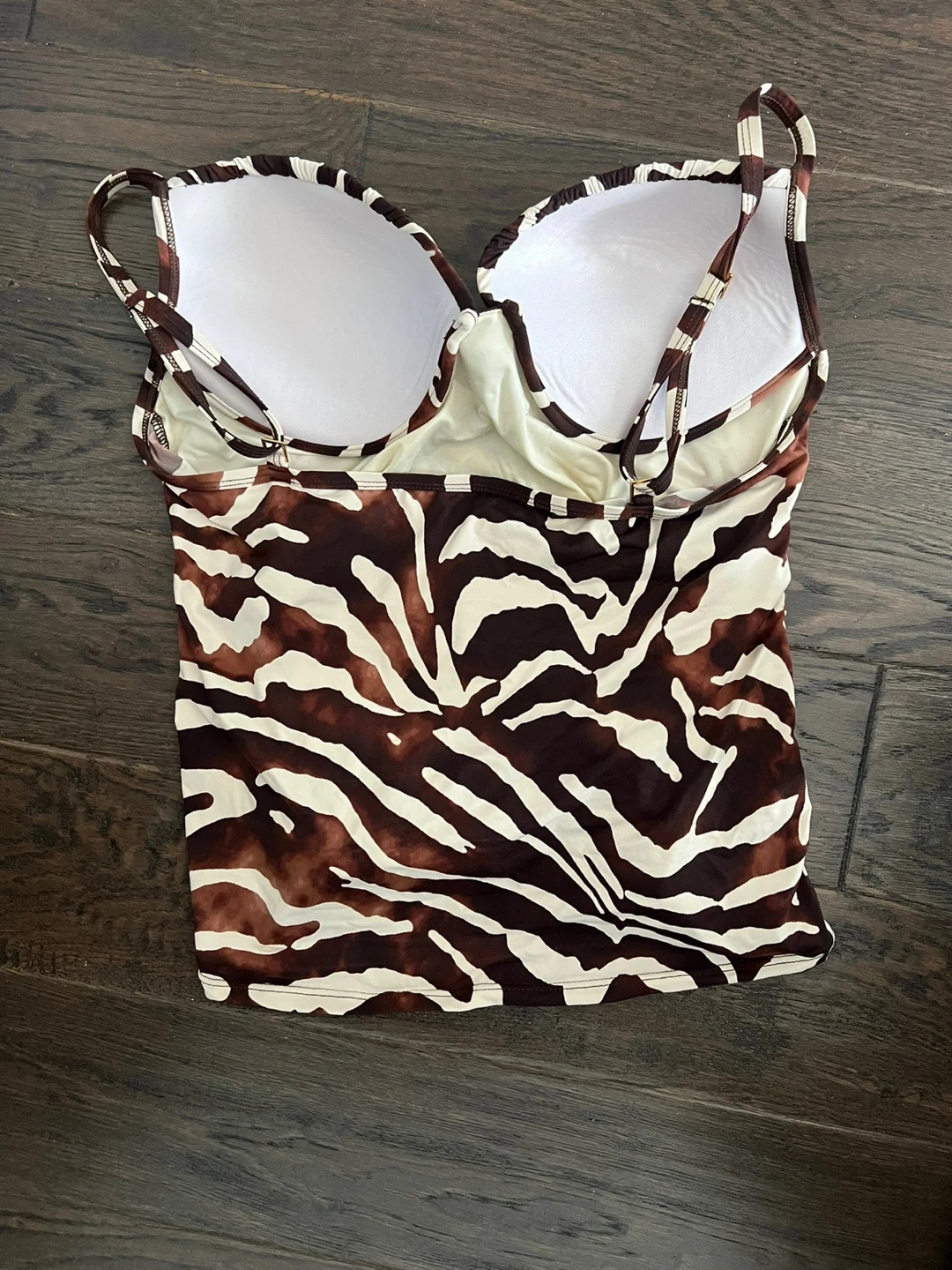 This La Blanca tankini top features a brown and white zebra print. It's made with 80% nylon and 20% elastane for the self fabric, and 84% nylon with 16% elastane for the lining. Size 14.