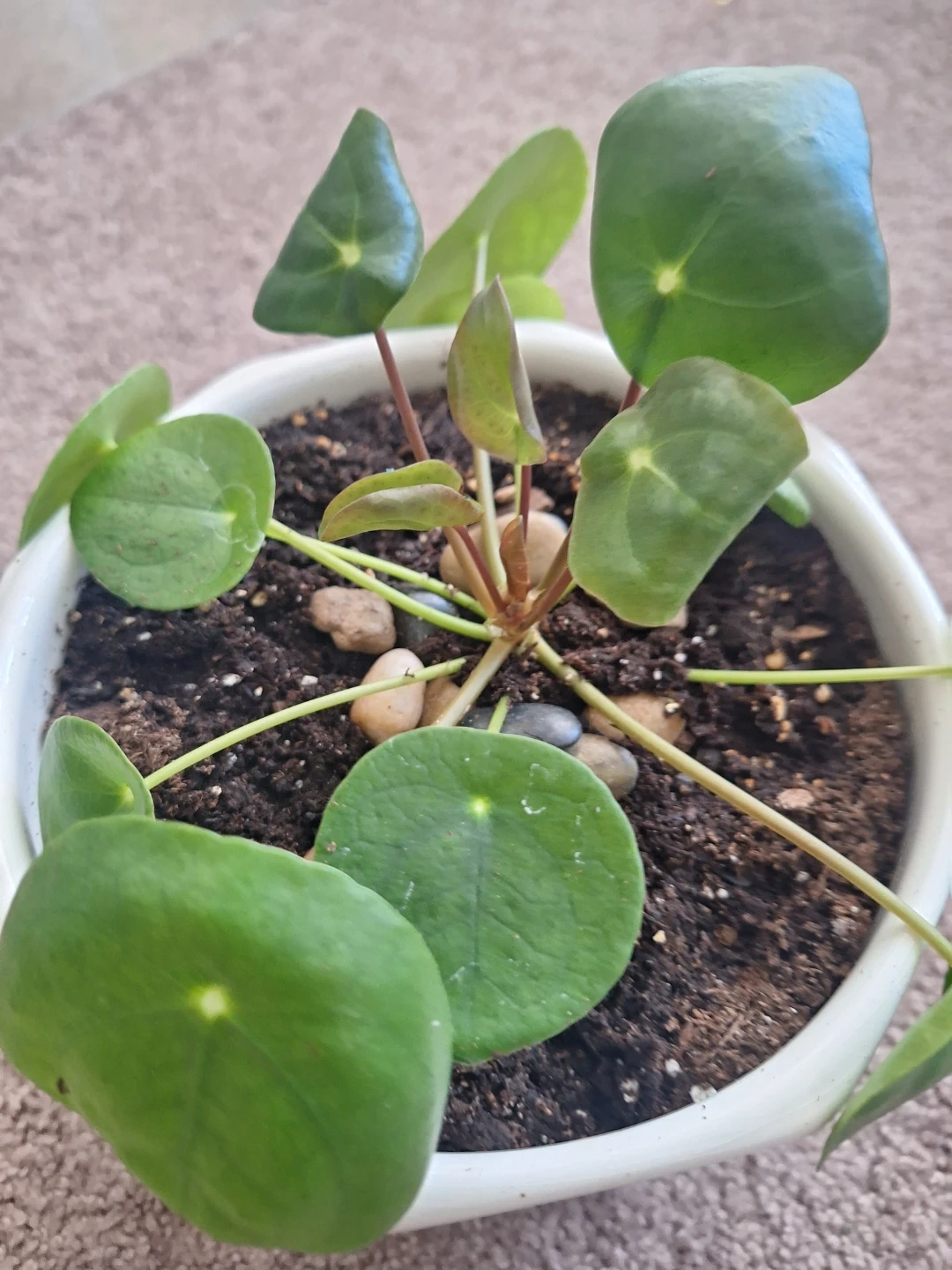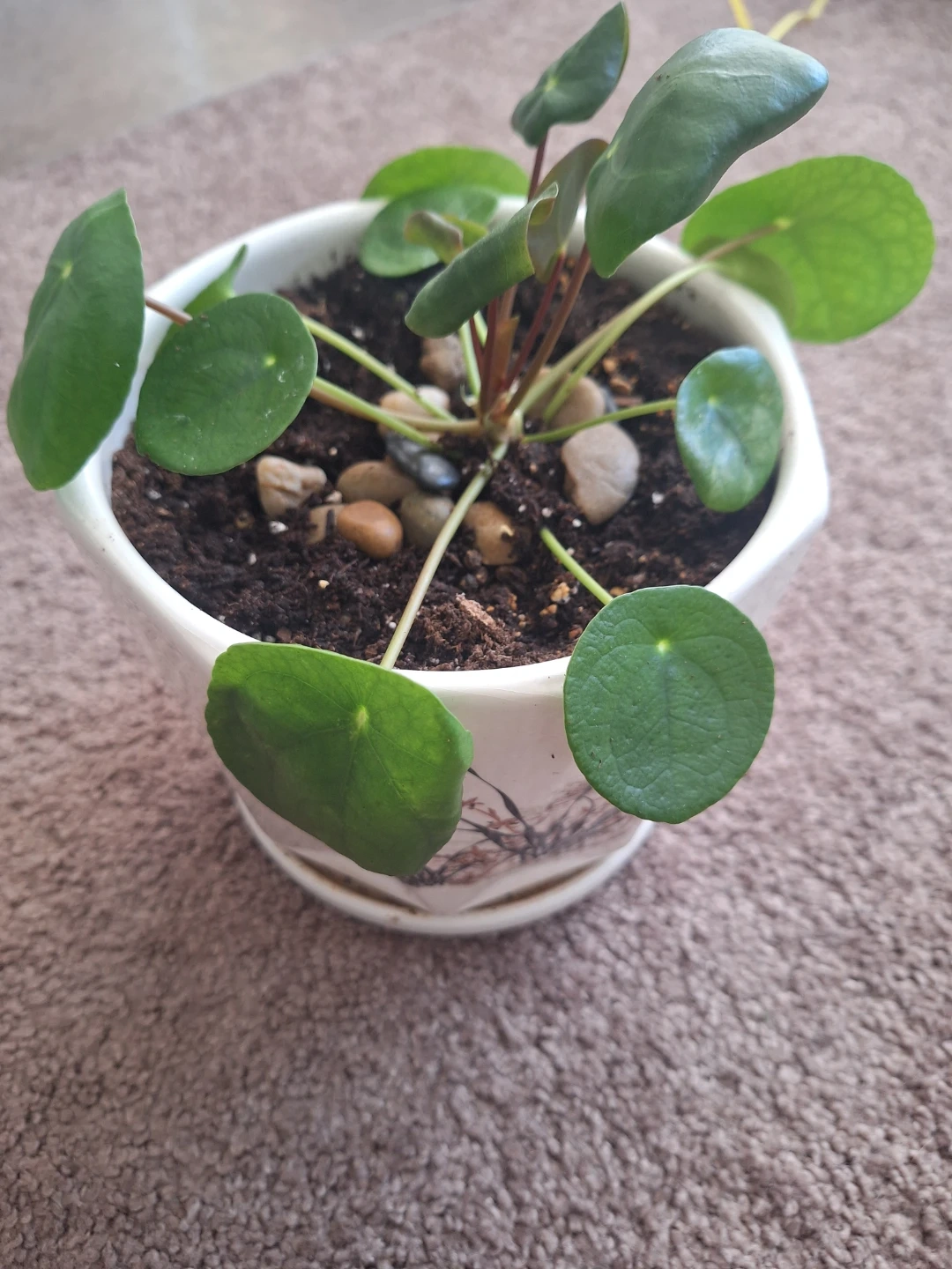 Pick up only. Healthy Pilea Peperomioides plant in a decorative white pot. Features round, coin-like leaves on vibrant stems. This plant is known for its easy care and unique appearance. It's a great addition to any indoor space! Easy to care. Around 8" tall.