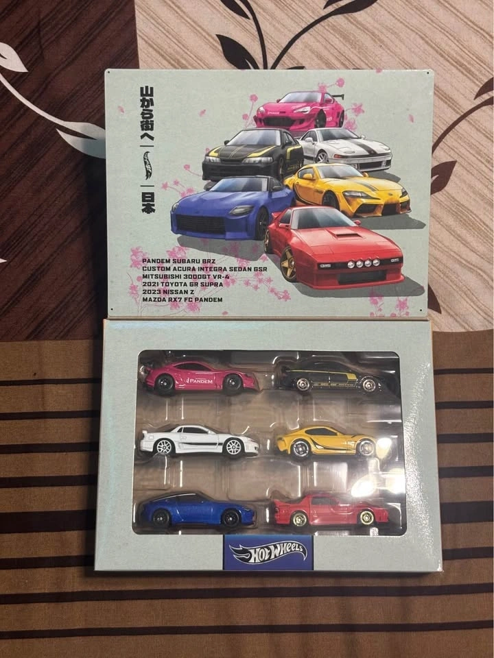 Brand new Hot Wheels 6-car set in original themed box. Includes Pandem Subaru BRZ, Custom Acura Integra Sedan GSR, Mitsubishi 3000GT VR-4, 2021 Toyota GR Supra, 2023 Nissan Z, and Mazda RX7 FC Pandem. Cars are 1:64 scale with detailed paint and wheels. Box is in great shape with Japanese-inspired artwork. Brand new and has not been opened. Pickup only.