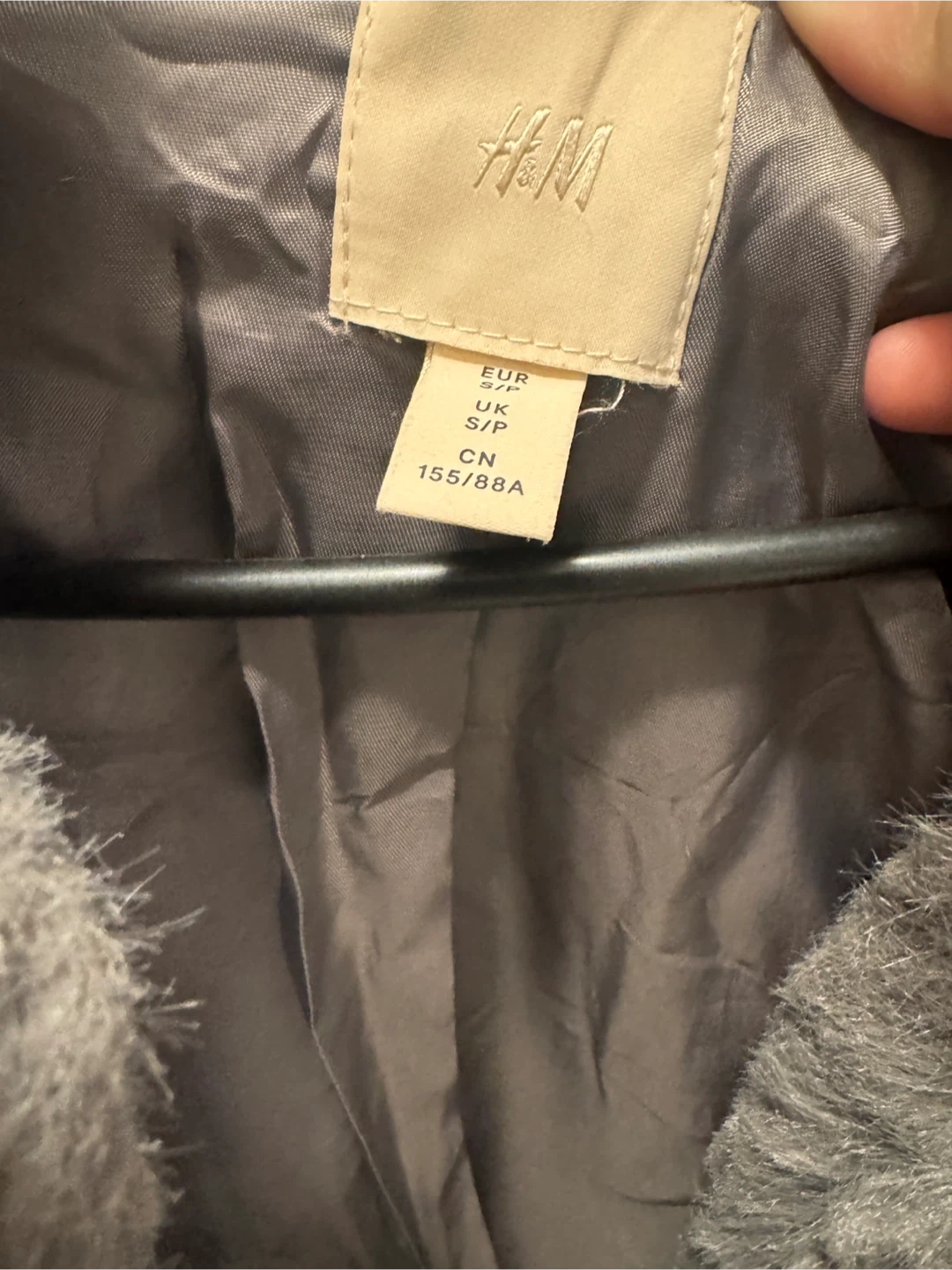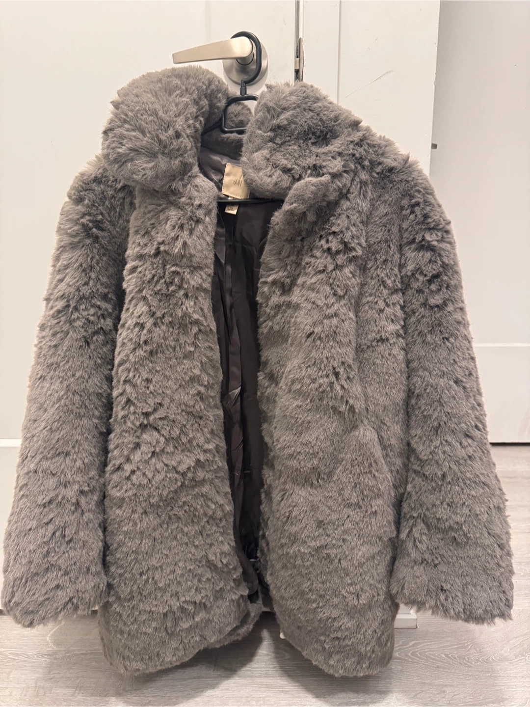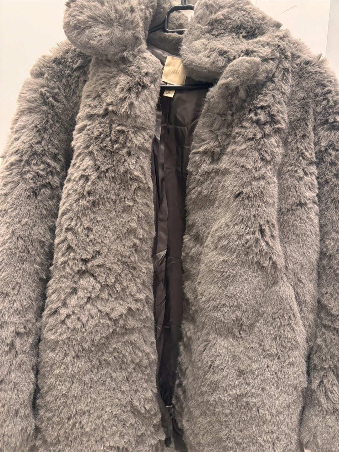 This H&M jacket is made from a soft, grey faux fur material with a dark lining. It features a classic collar design. It's a size S/P (UK). Good for medium size as well