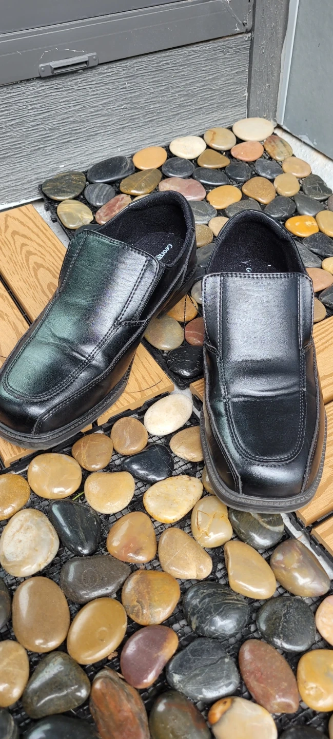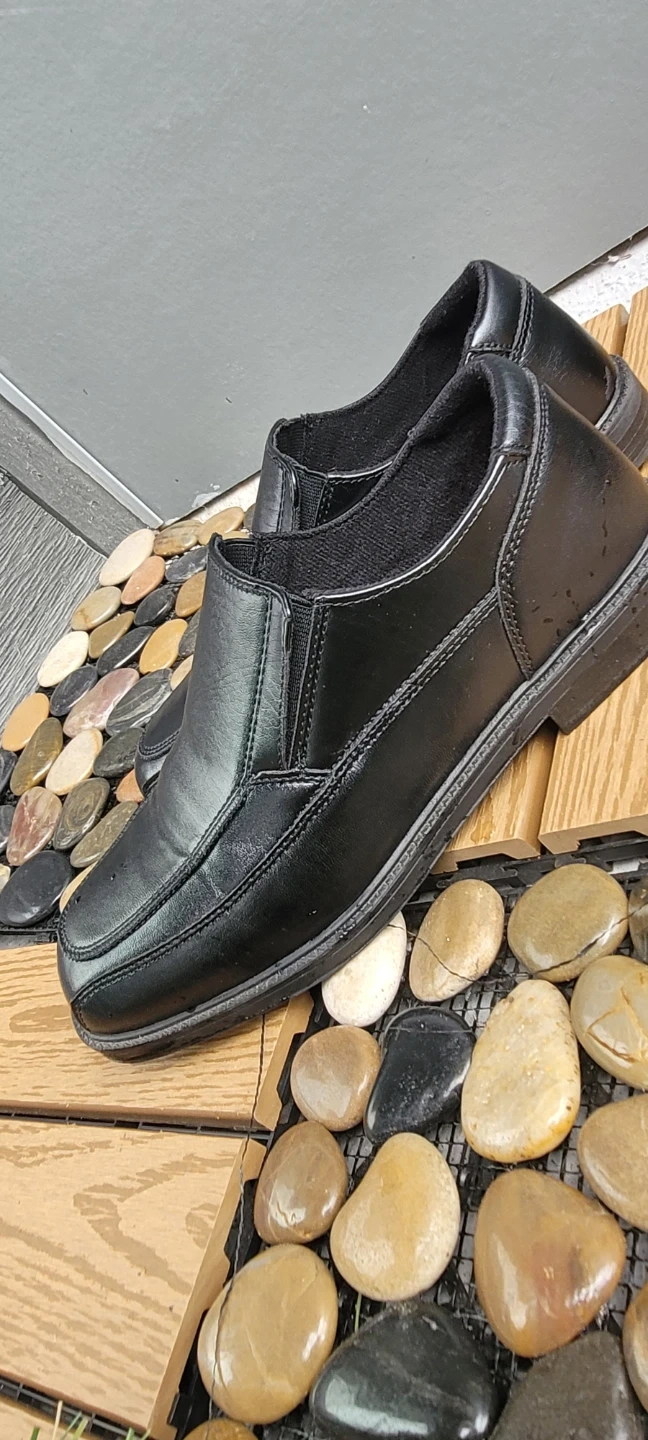 These black slip-on loafers are made with a smooth faux leather material. They feature a classic moc-toe design with elastic gore panels for easy wear. Perfect for everyday casual or dressy occasions.