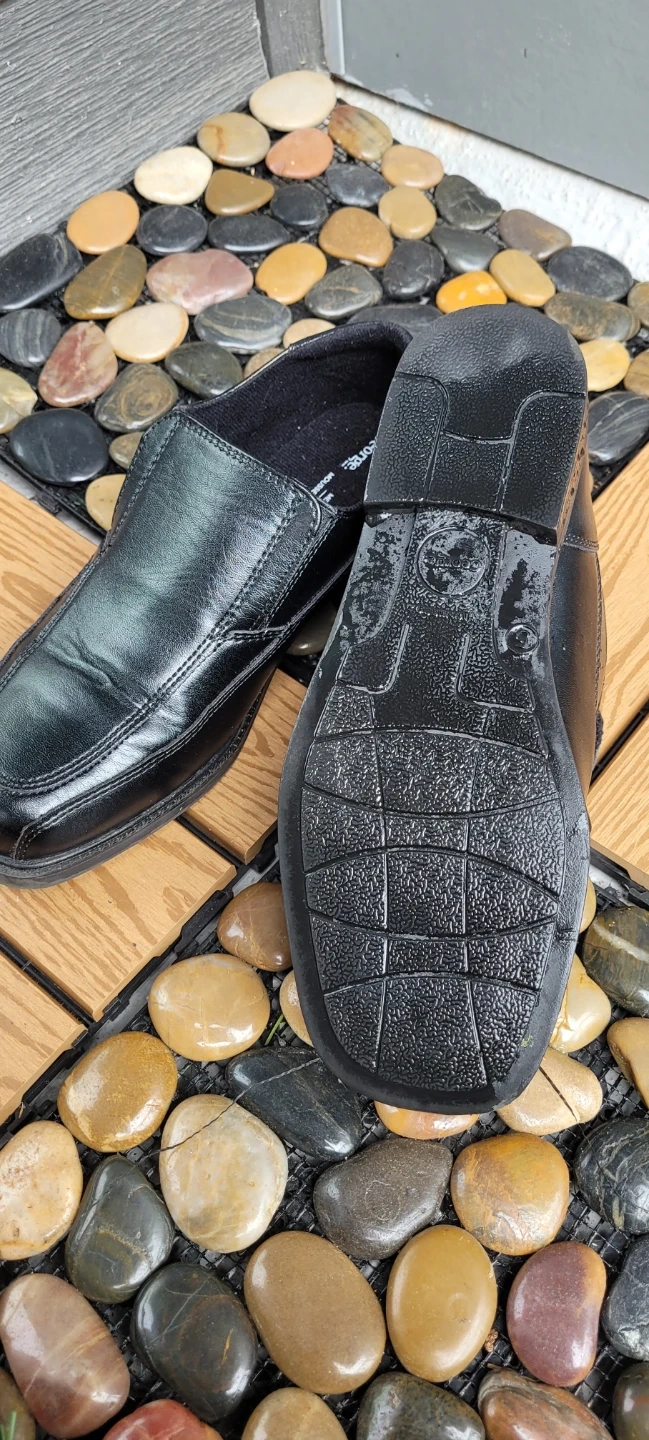 These black slip-on loafers are made with a smooth faux leather material. They feature a classic moc-toe design with elastic gore panels for easy wear. Perfect for everyday casual or dressy occasions.