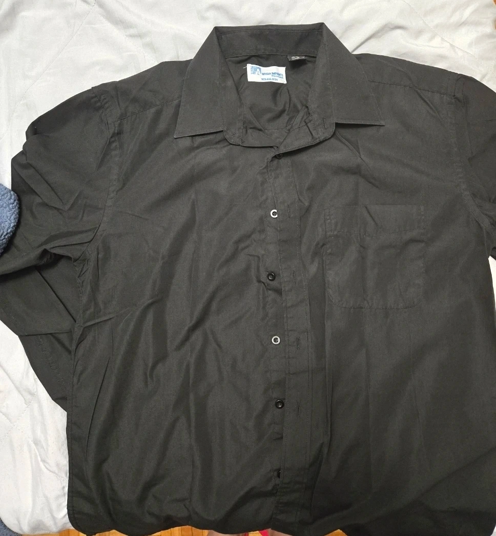 Classic black button-up long sleeve shirt. It's a standard fit with a single chest pocket. Made of a smooth, likely polyester blend fabric.( Available 2 pcs)