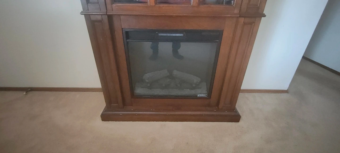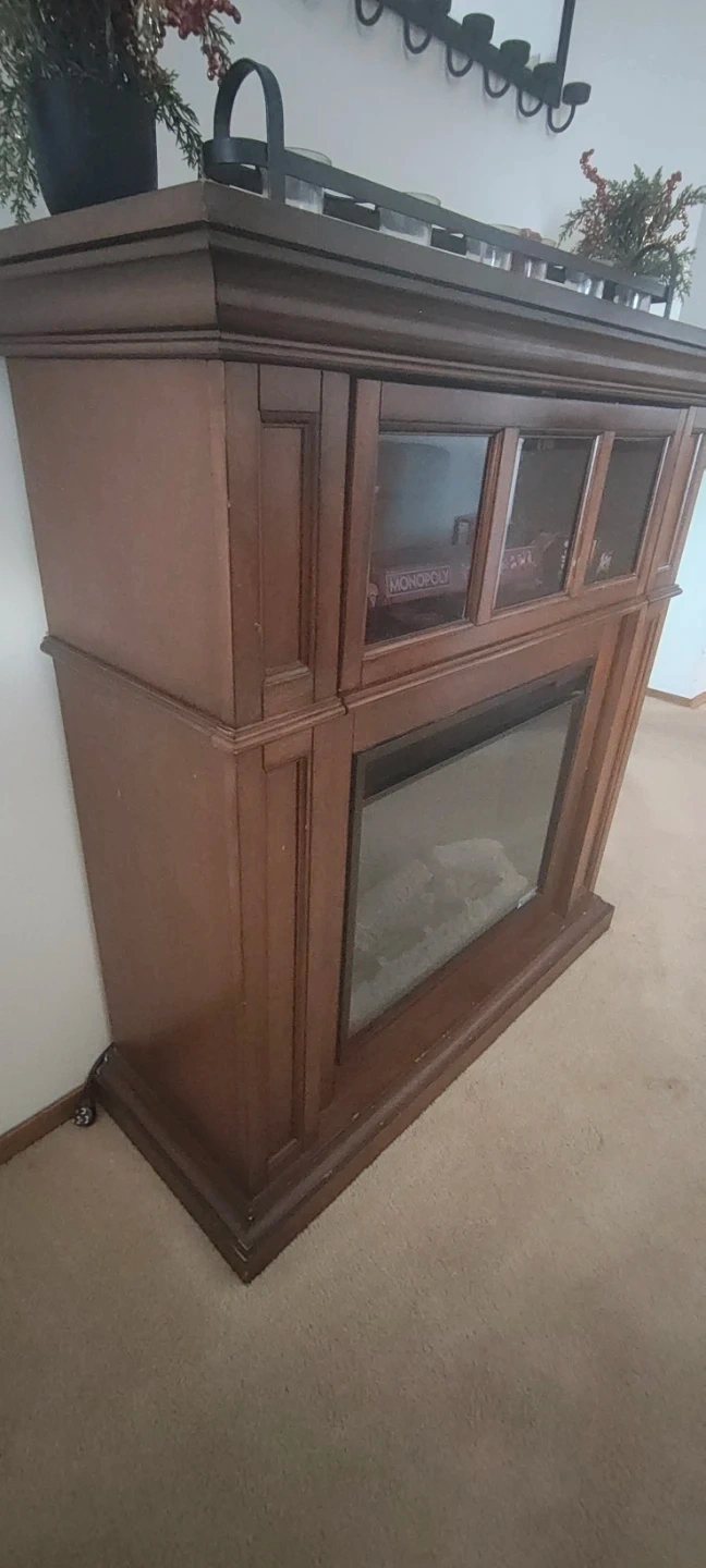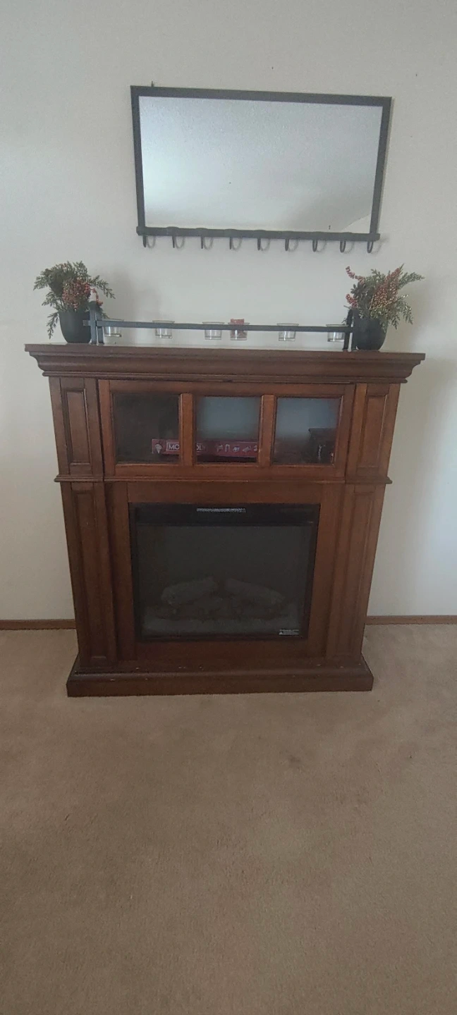 This electric fireplace has a wooden mantle and glass doors. It's great for adding ambience to a room!
