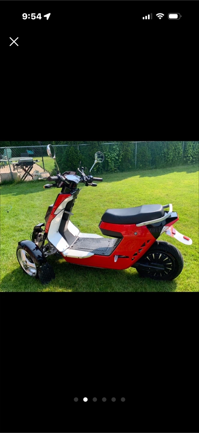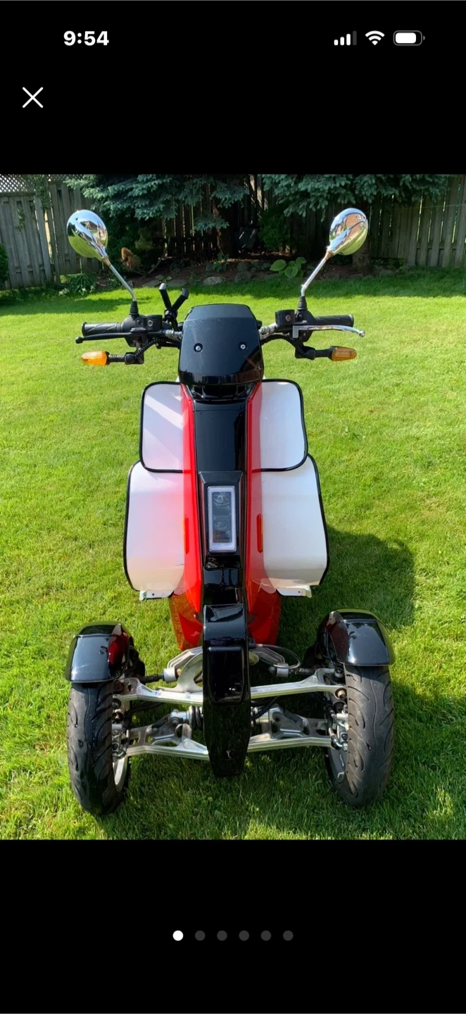 This is a red three-wheeled electric scooter. It's a unique way to get around town! Big battery 70v/ 42hp can let you ride up 60 km with one single charge. Really fun and fast to drive. Really good for doing Uber eats, original price was 7.499,00 and is unique 😉