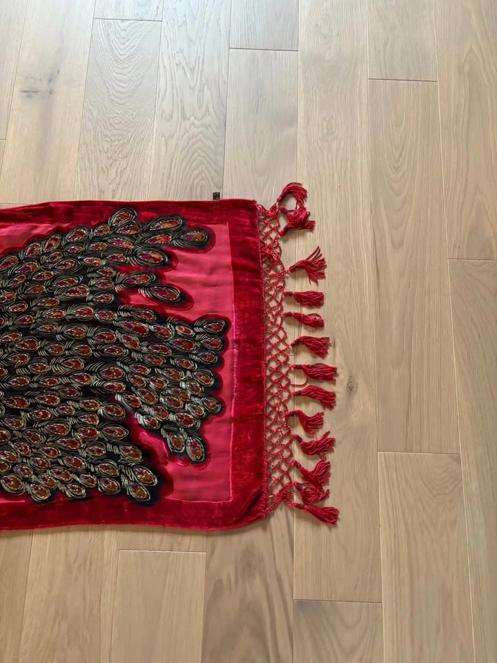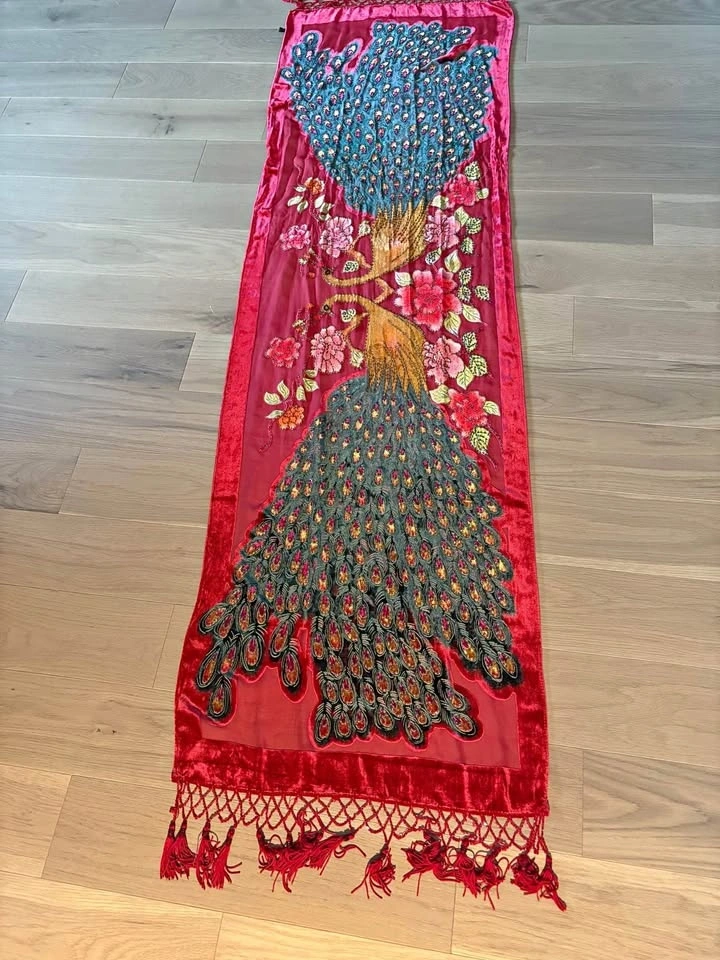 Hand-Beaded Silk & Velvet Peacock Shawl – Never Worn
