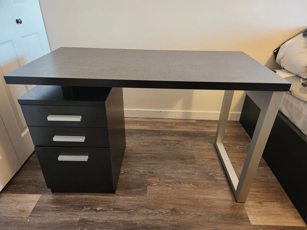 Selling a dark brown desk with drawers. In great shape and ready for a new workspace! Perfect for a home office or study area. 23.5 in x 47.5 in surface space and convenient storage with drawers.