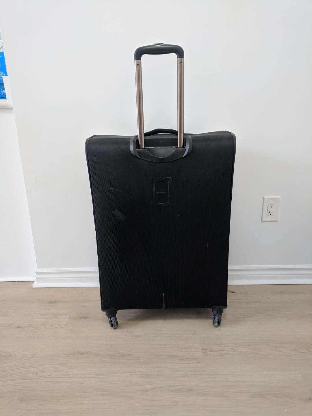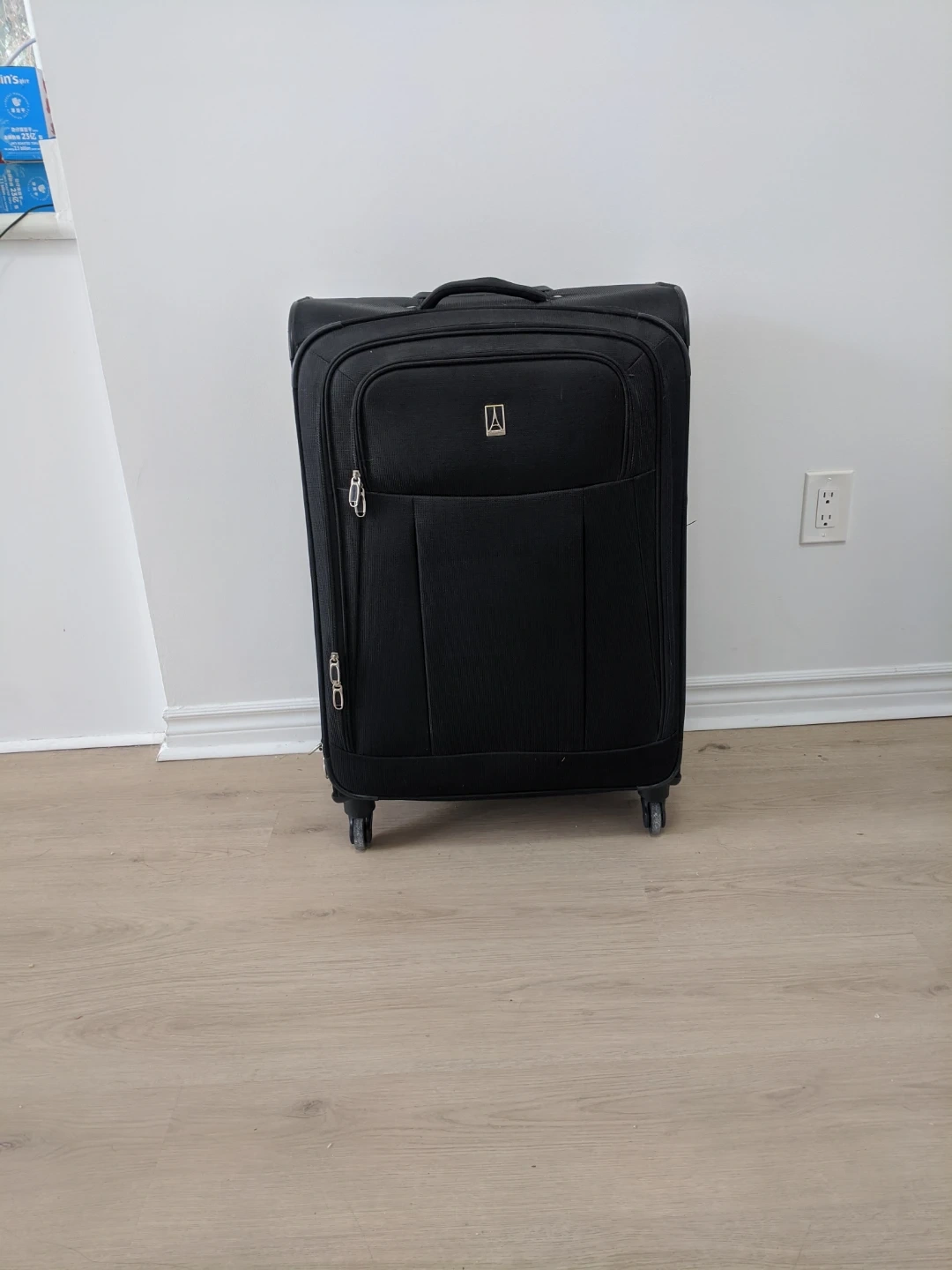 This is a black Travelpro softside spinner suitcase. It's made of durable fabric and has spinner wheels for easy manoeuvrability. It's a great size for weekend trips or Air luggage for longer journeys. Pick up at 195 Merton Street Toronto or pick up at Subway station Davisivill. And I can deliver it to your house but you need to pay me another $5. Thanks.