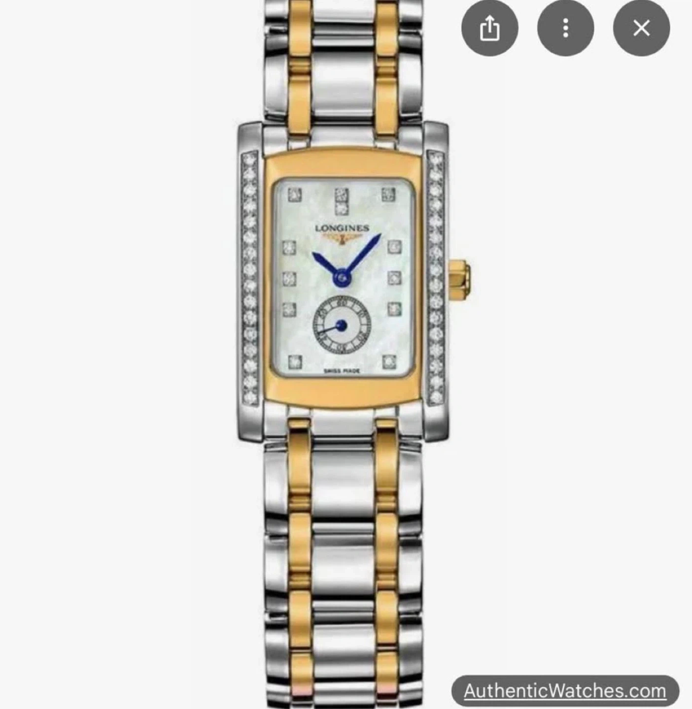 Selling a Longines Mini Dolcevita watch. It's a beautiful timepiece that adds a touch of elegance to any outfit. The watch features a rectangular face with diamond detailing. A screenshot shows the original price was $10,200 CA