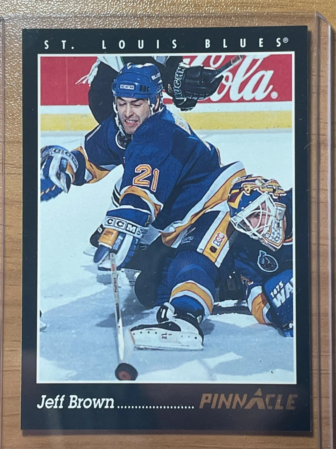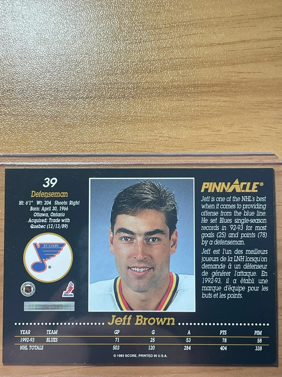 This is a 1993 Pinnacle hockey card featuring Jeff Brown. It details his position as a defenseman, his career stats from the 1992-93 season with the Blues, and his career totals.