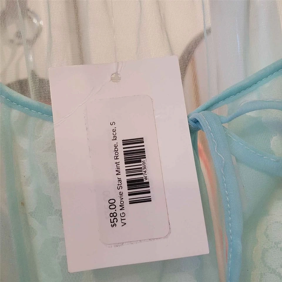 Mint vintage Movie Star robe. Light blue sheer fabric with lace accents. Made of 100% Nylon Tricot. Size Small. Long length with 3/4 sleeves. Tie closure at neck.