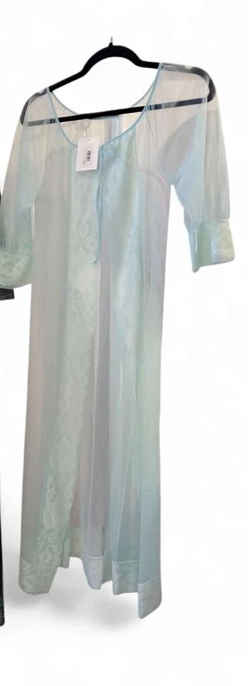 Mint vintage Movie Star robe. Light blue sheer fabric with lace accents. Made of 100% Nylon Tricot. Size Small. Long length with 3/4 sleeves. Tie closure at neck.