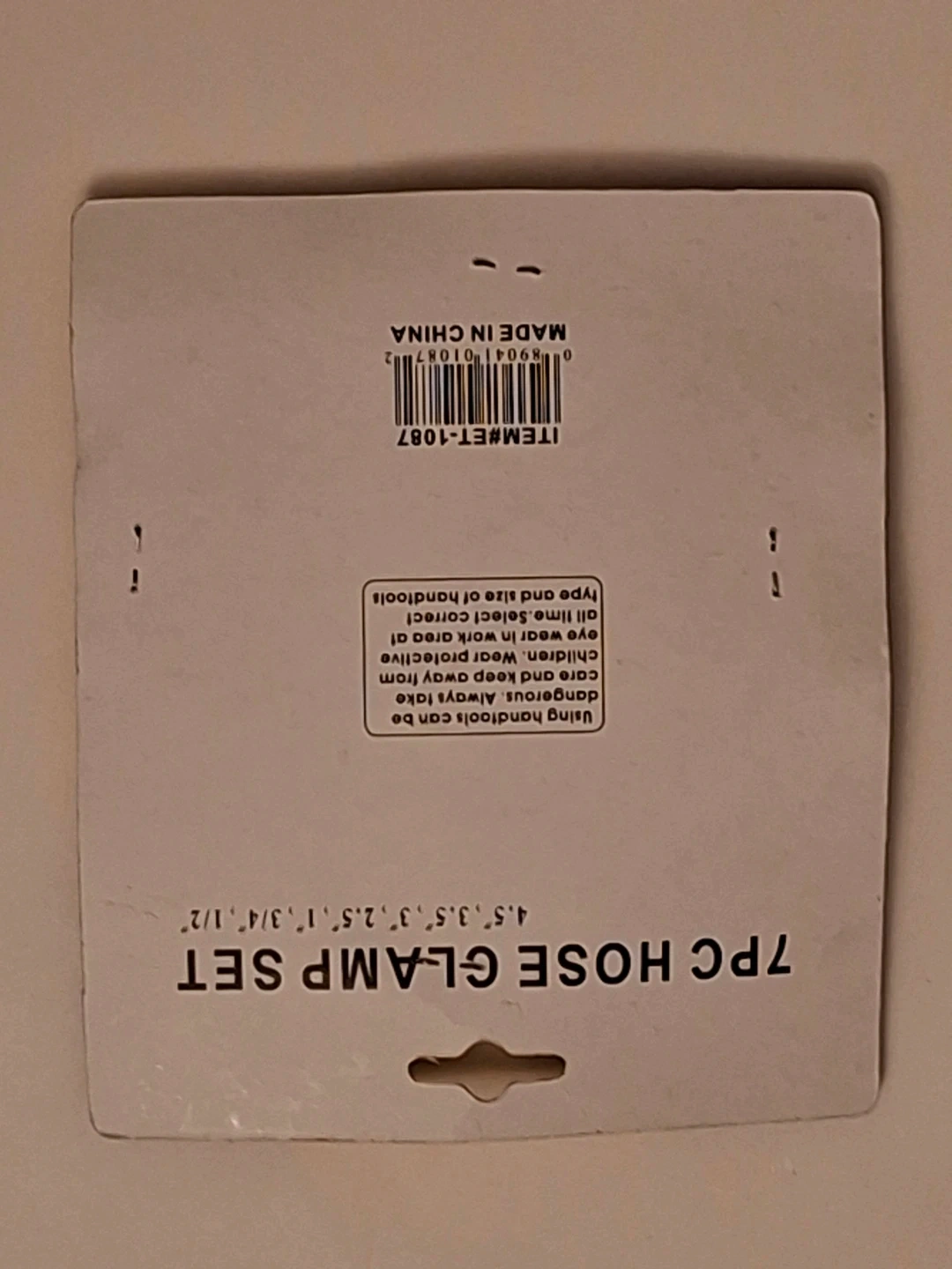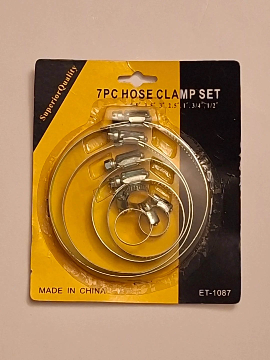New hose clamp set includes 7 pieces of various sizes. Set contains clamps in 4.5, 3.5, 3, 2.5, 1, 3/4, and 1/2 inch diameters. Clamps are made of silver-tone metal with adjustable screw mechanisms. Item is still in original retail packaging.