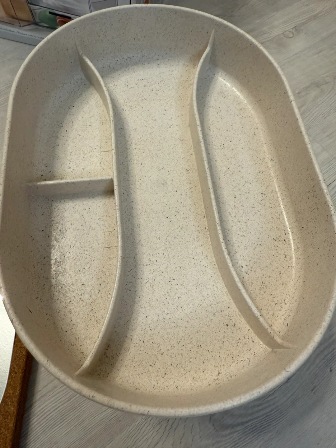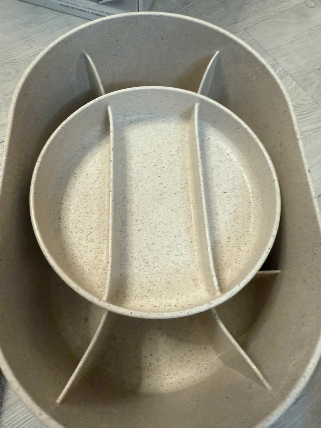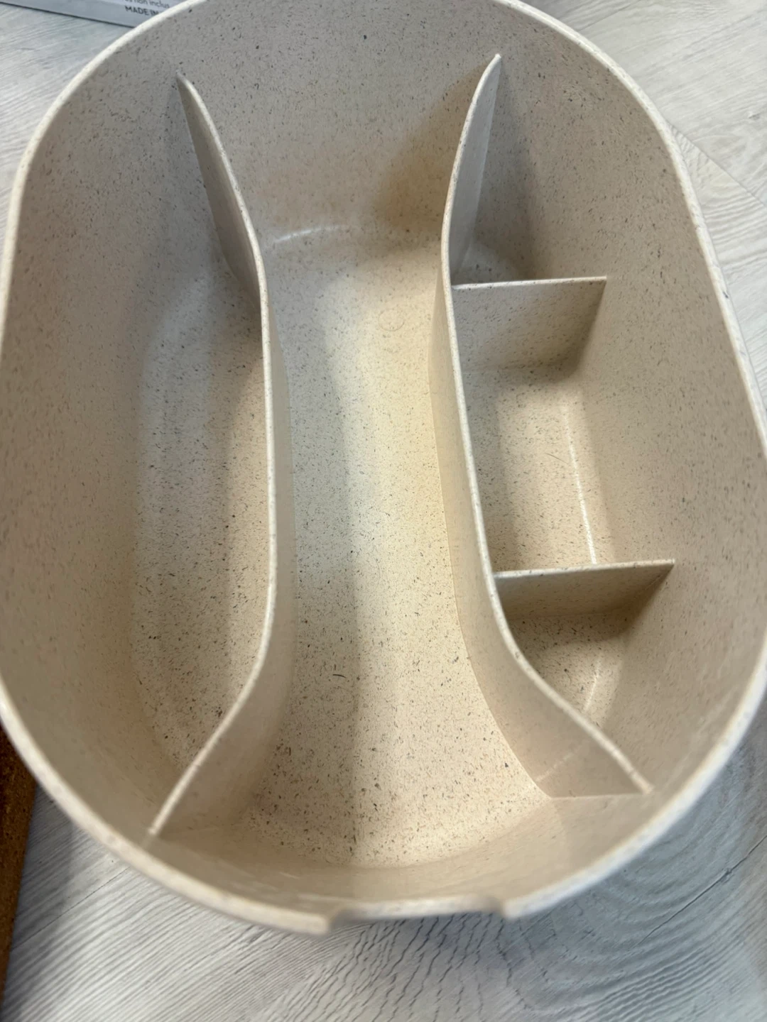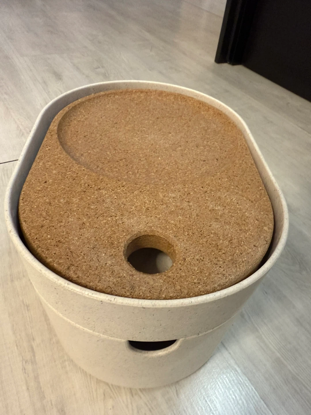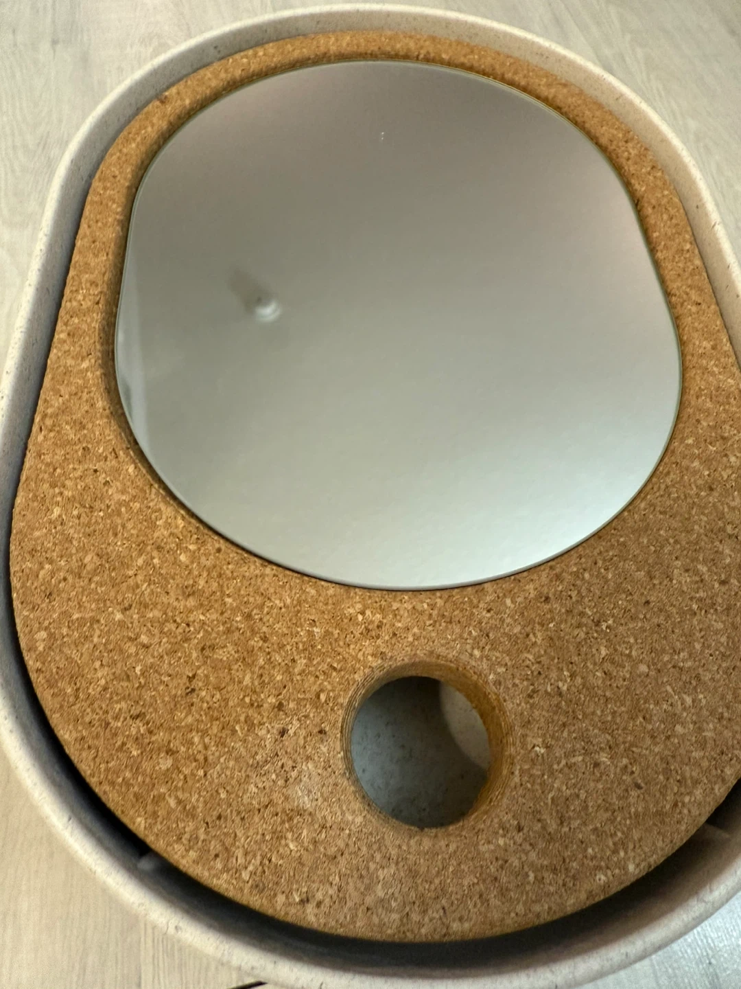 This is a beige makeup organizer with a unique cork mirror lid. It's in great condition and ready to help you keep your beauty products tidy and accessible!