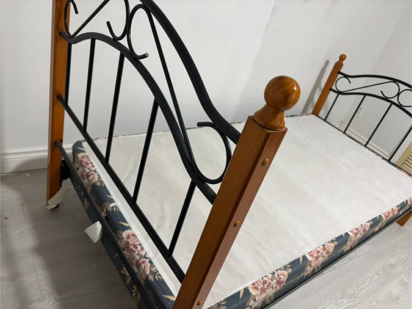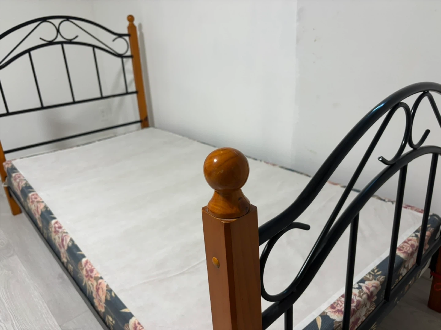 This twin bed frame features a combination of black metal and wood posts. It's covered with a floral-patterned box spring. Perfect for a child's room or guest bedroom!