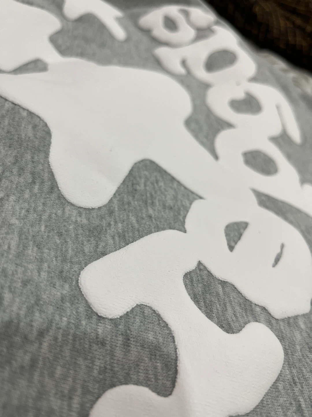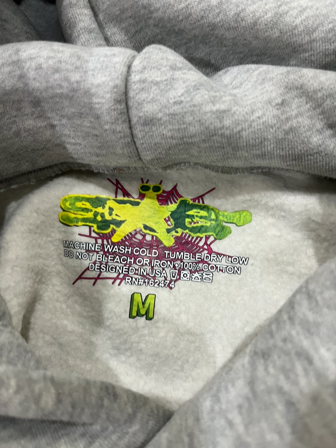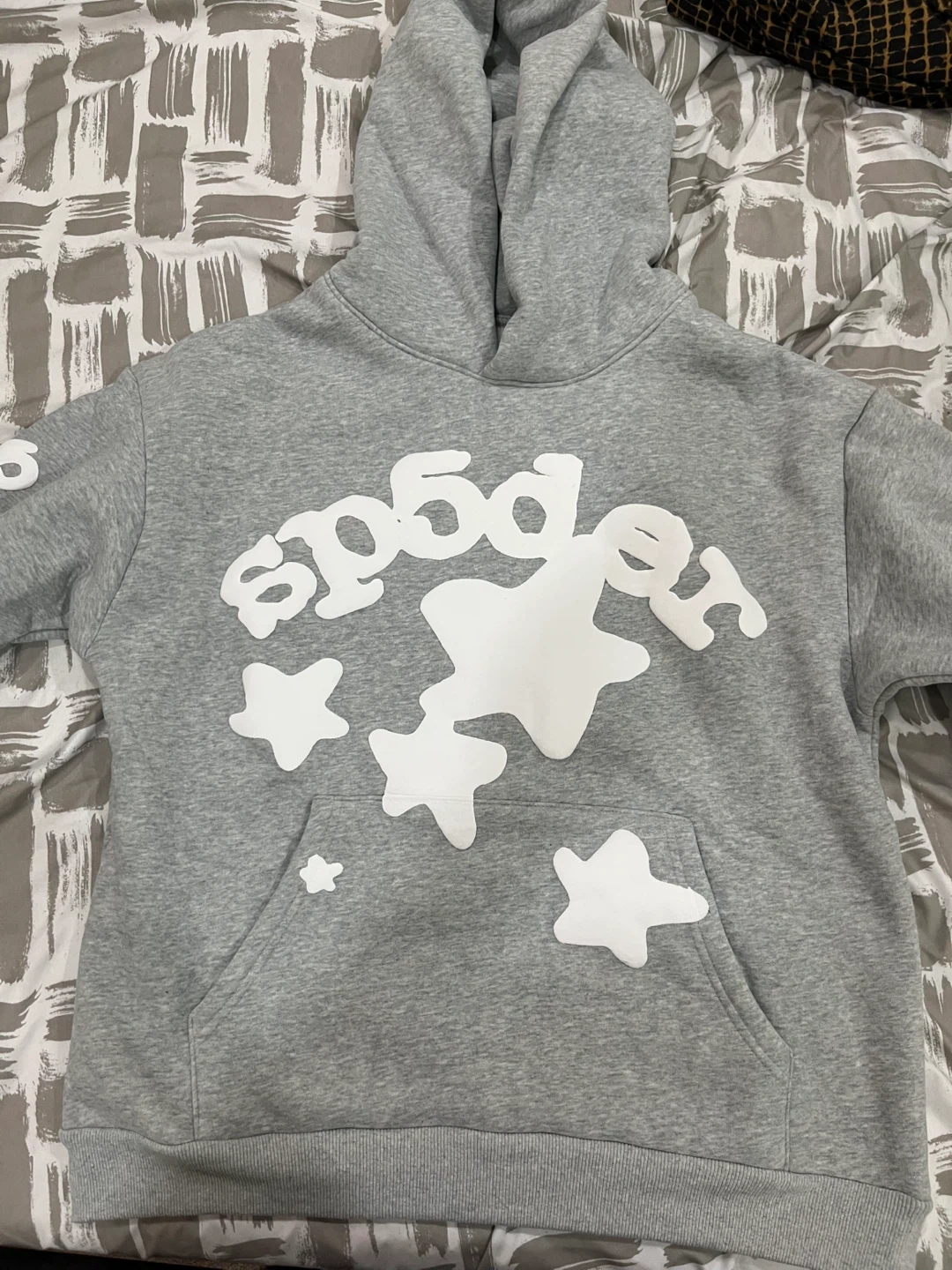 Grey Sp5der hoodie with white puff print design. Made with 100% cotton and designed in the USA. Size is medium.