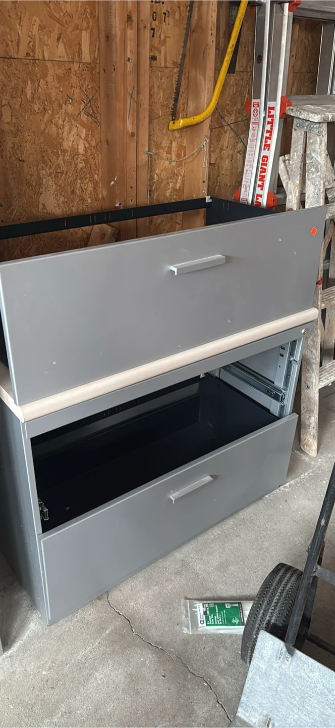 A grey two-drawer filing cabinet. It has metal drawer slides. This cabinet is great for organizing your office or home paperwork.