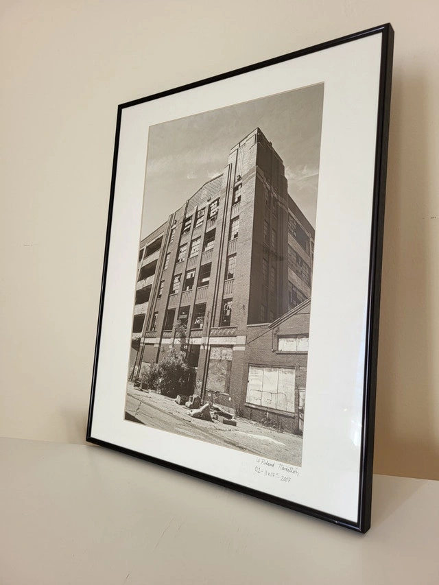 Framed black and white photo print of The Packard Plant (Detroit, MI) - Chromira 11"x14". The matte is acid-free. The print is signed on the front (recto) and back (verso). Artist: W Roland Hamilton. Cat No: 01-11x14-2007. Date: circa 2007.